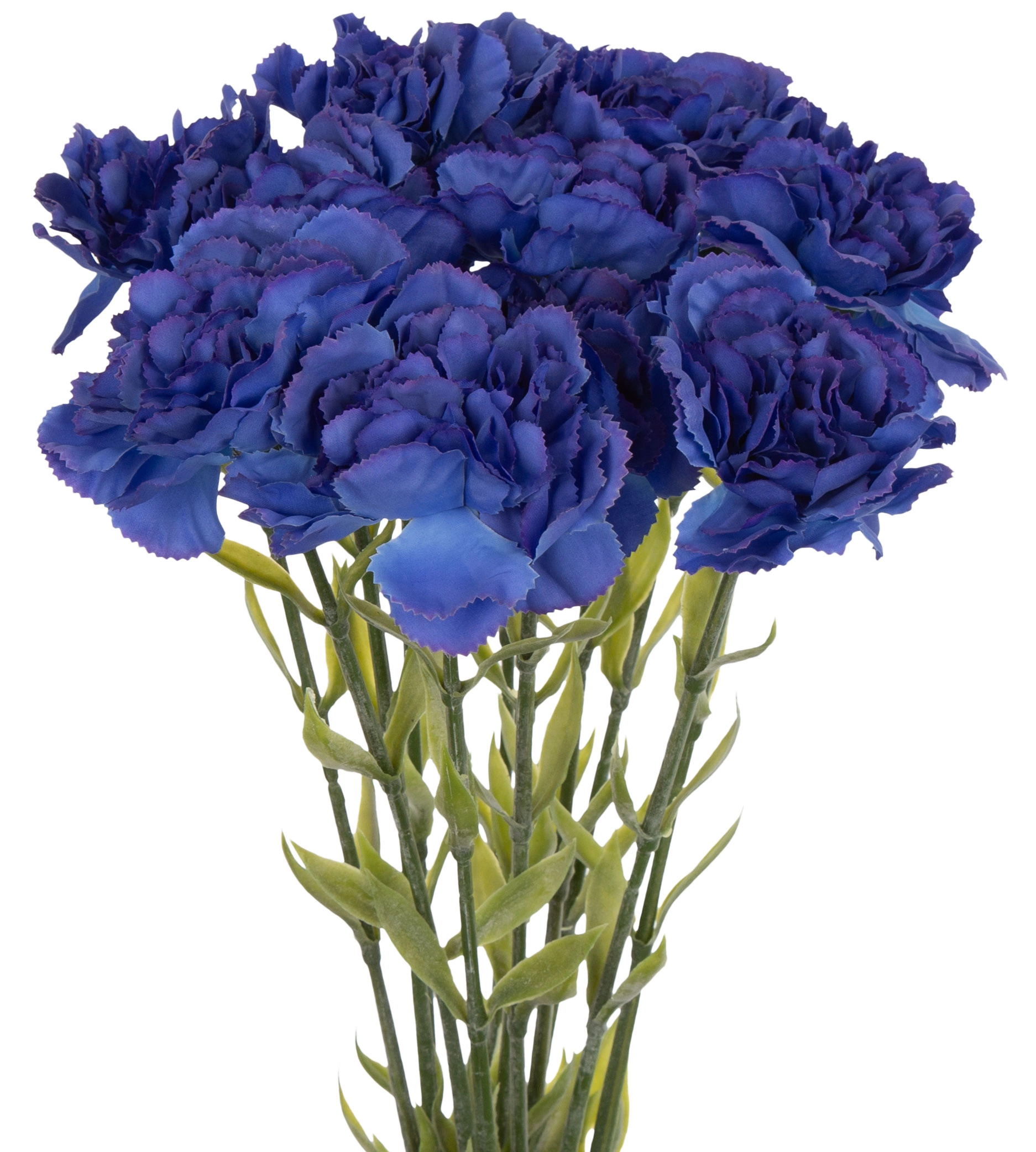 Oferta przedstawia kwiat sztuczny łodygowy – goździk. Kwiat wykonany z materiału w kolorze niebieski z poświatą fioletu  ( BLUE VIOLET ) , łodyga z tworzywa sztucznego w kolorze ciemnej zieleni.
