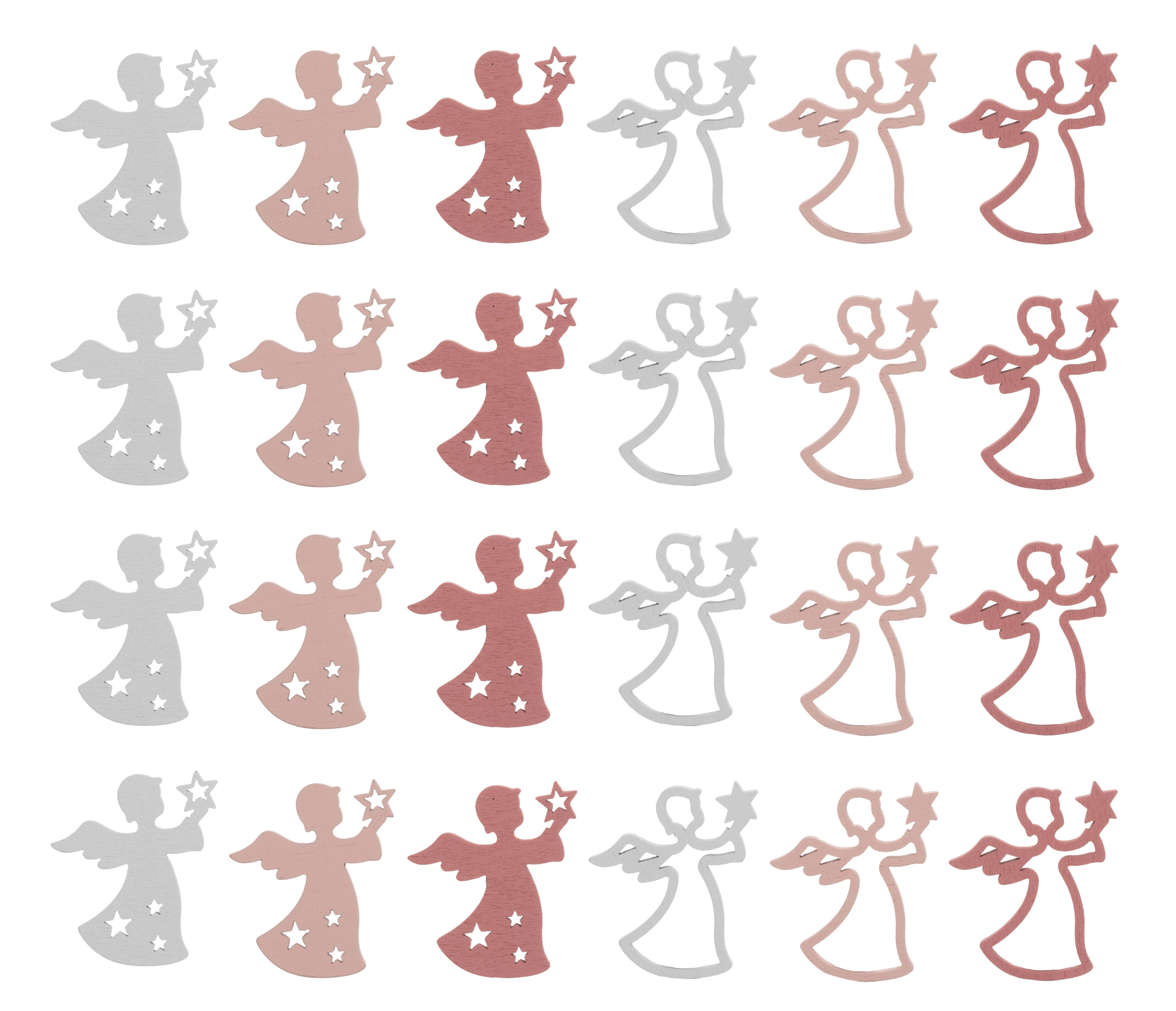 Oferta przedstawia aniołki drewniane w kolorze białym i różowym. Wykrawki idealne do zdobienia, kartek, prezentów, bukietów. W opakowaniu 24sztuki.