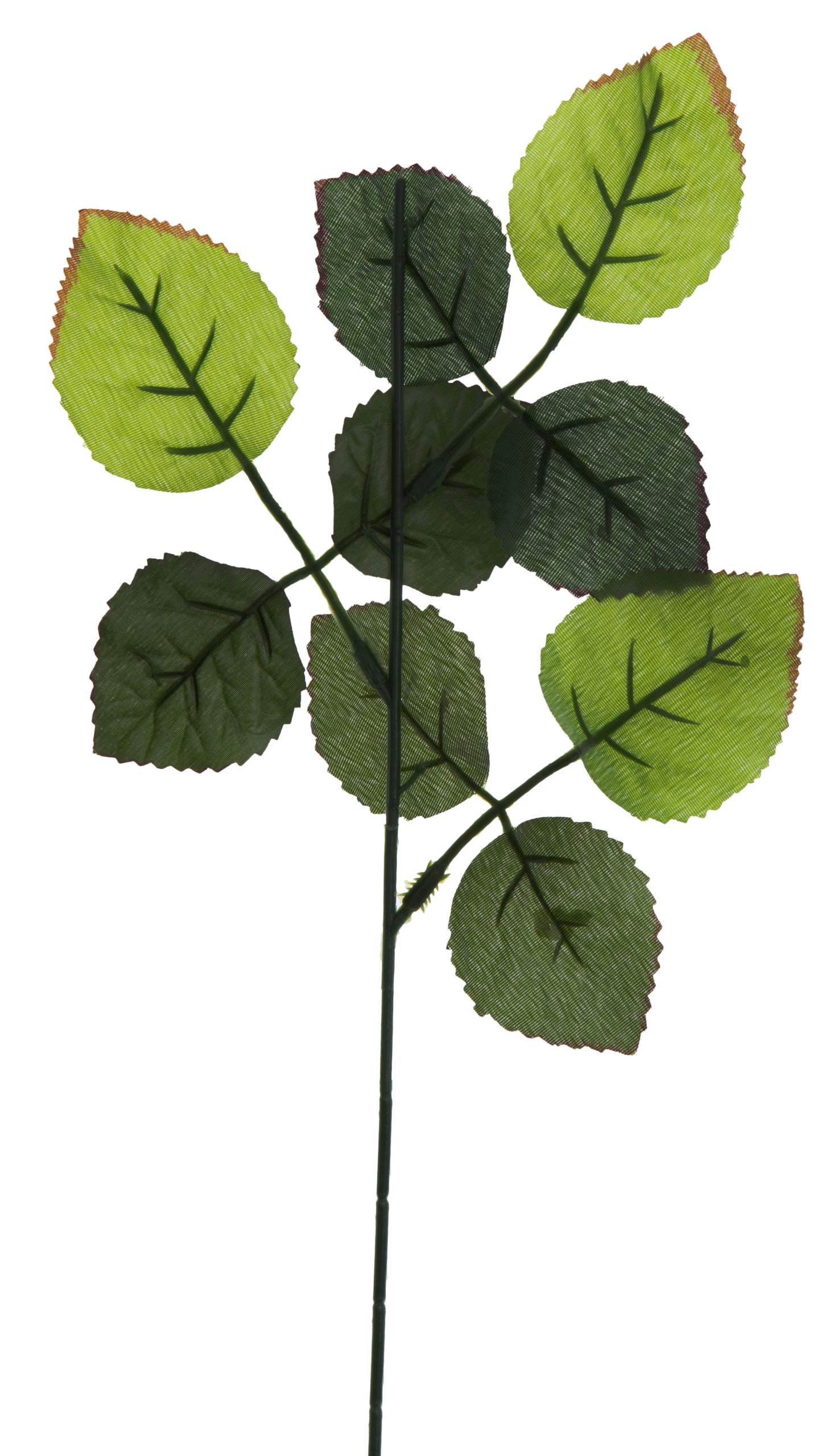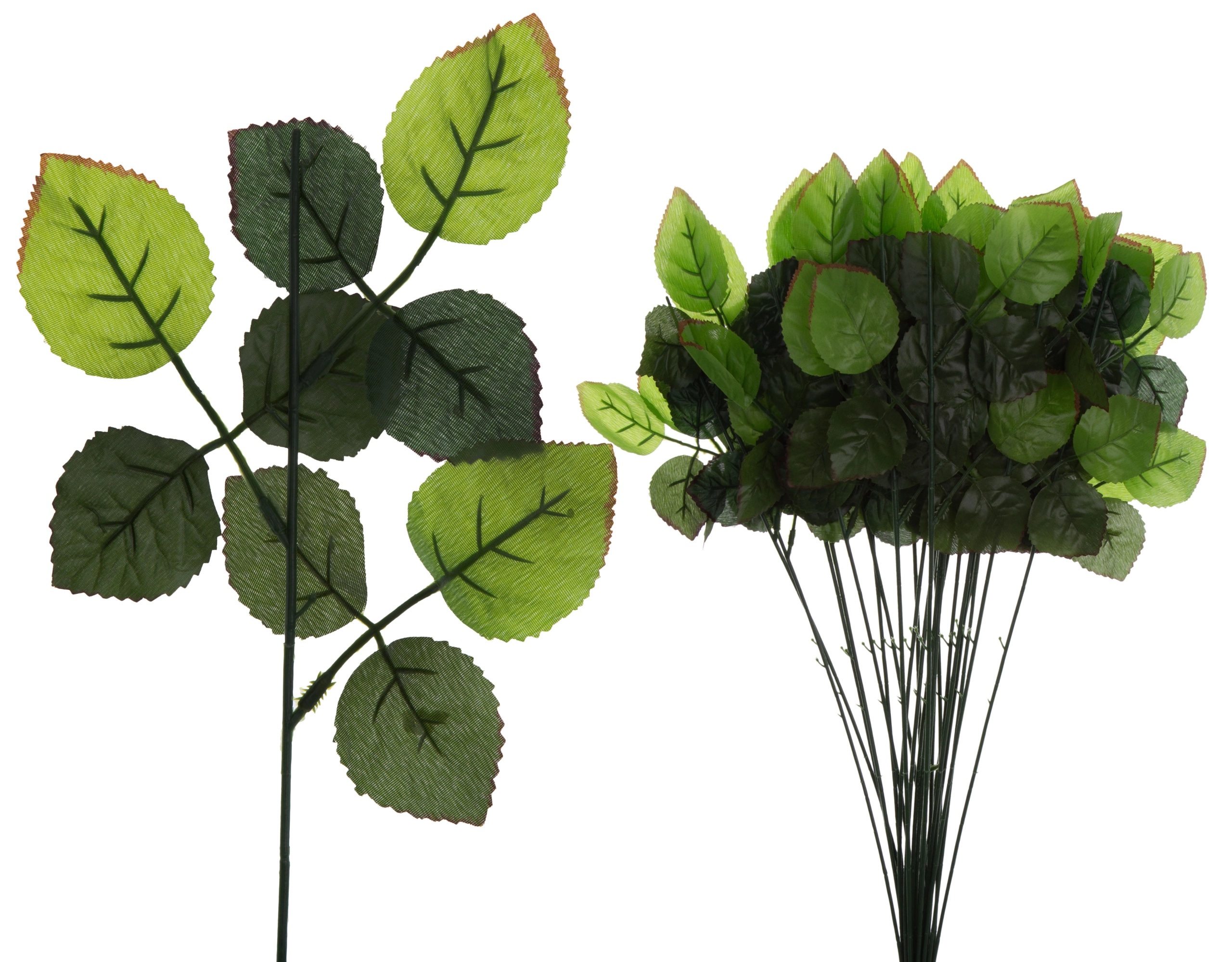 Oferta przedstawia łodygę róży. Łodyga z tworzywa sztucznego w kolorze zielonym, posiada trzy gałązki z listkami z materiału w tonacji zieleni z delikatną bordową obwódką. Na końcu jest miejsce na różę wyrobową. Łodyga idealna do wyrobów florystycznych, oraz kompozycji kwiatowych. Łodyga sprzedawana po 24 sztuki, cena podana za paczkę.