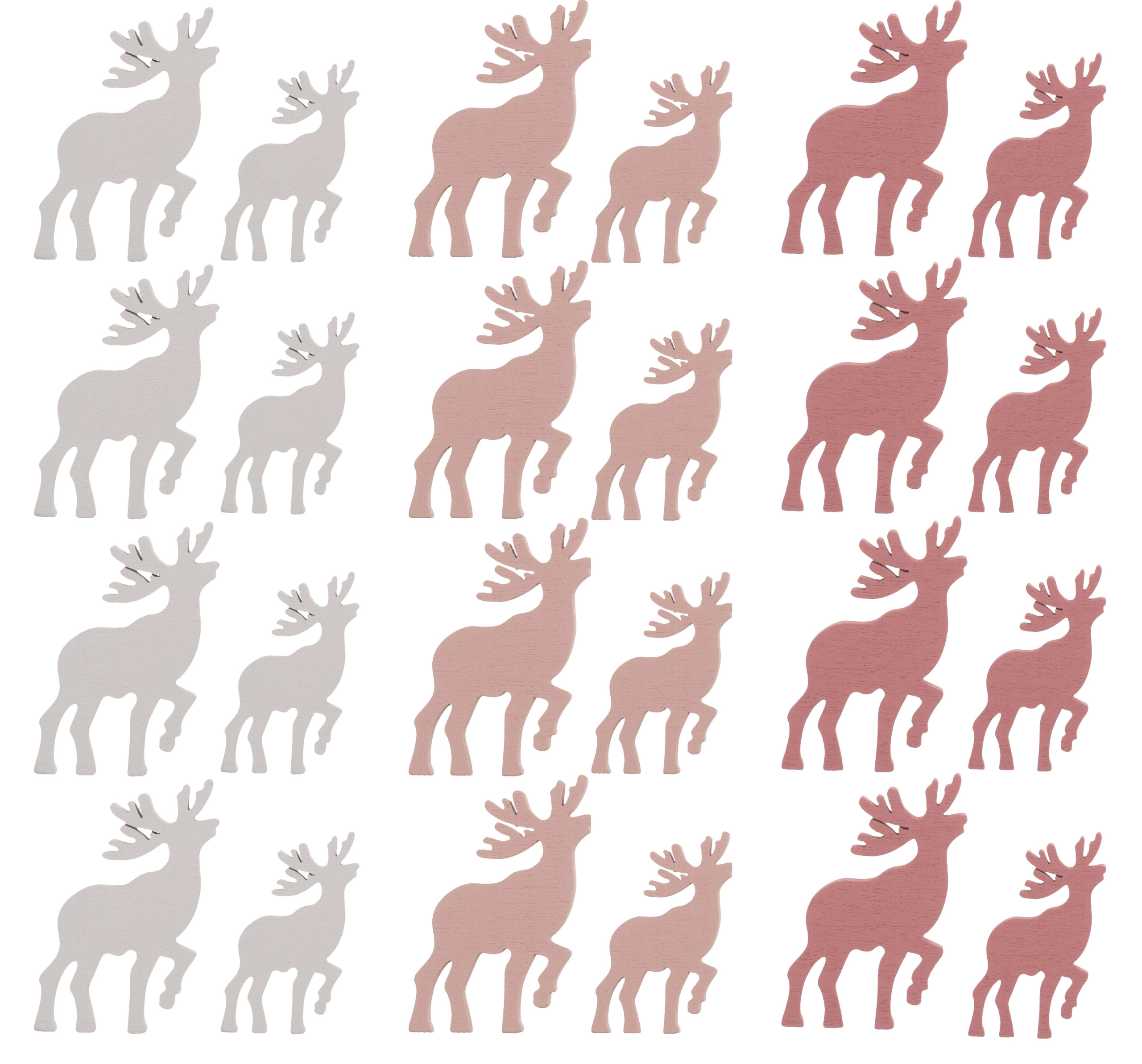 Oferta przedstawia renifery drewniane w kolorze białym i różowym. Wykrawki idealne do zdobienia, kartek, prezentów, bukietów. W opakowaniu 24sztuki.