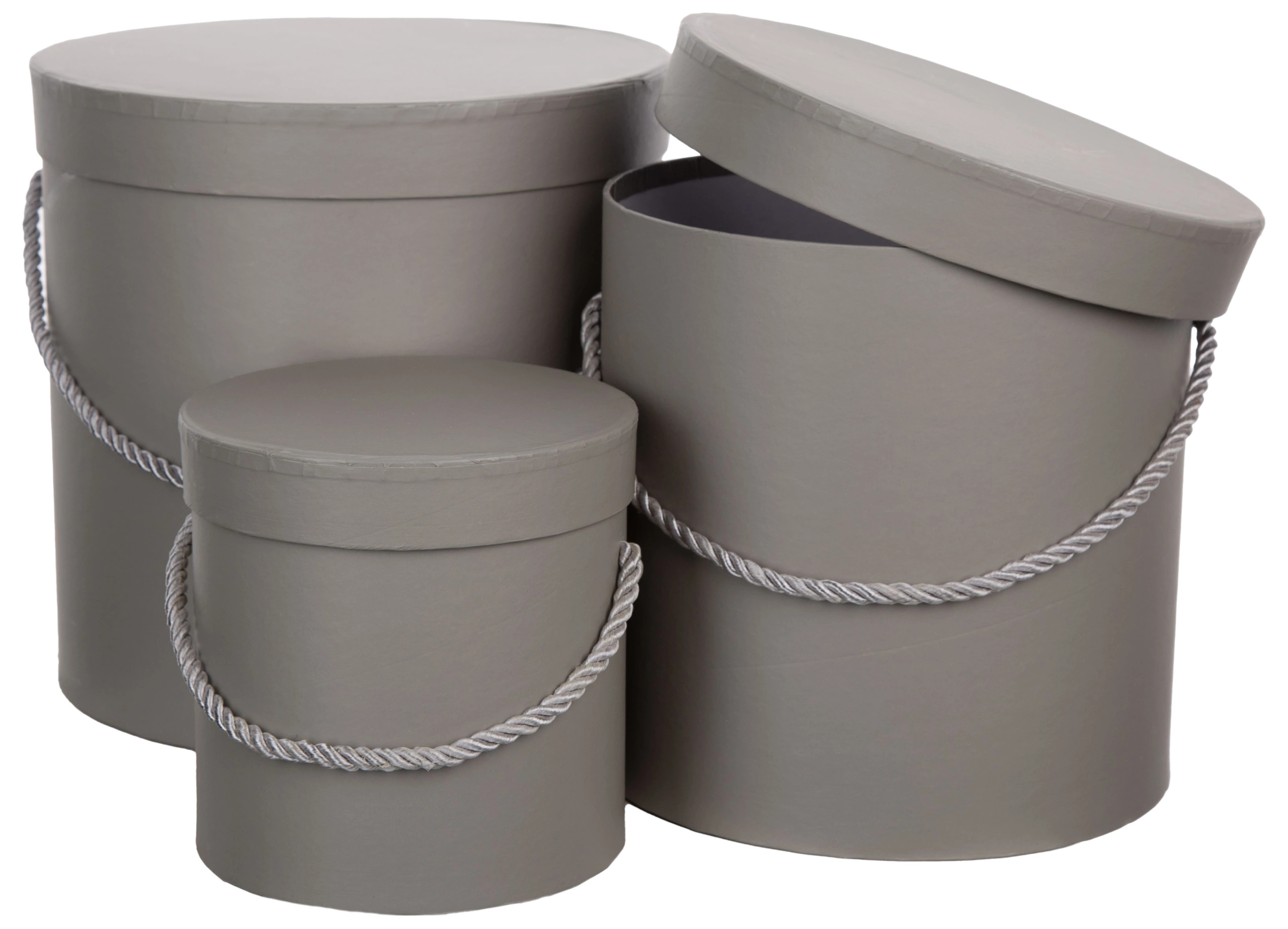 Oferta przedstawia pudełka ozdobne w kolorze szarym ( GRAY ). Flower box sprawdzi się do ułożenia kompozycji florystycznych, opakowania prezentu, do przechowywania drobiazgów. Opakowanie zawiera trzy sztuki w różnych rozmiarach.