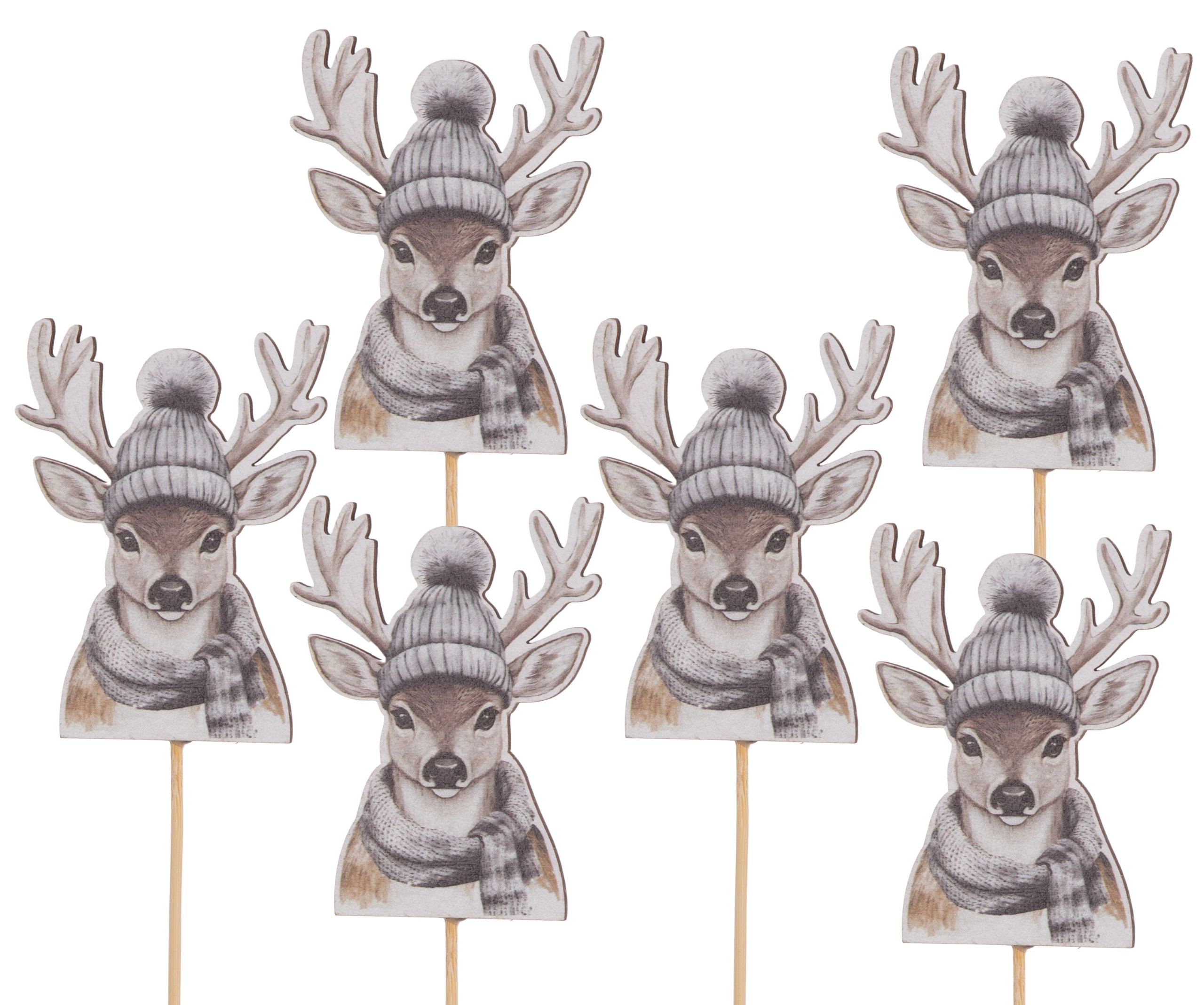 Oferta przedstawia renifery ze sklejki na piku. W opakowaniu znajdują się 6 sztuk.