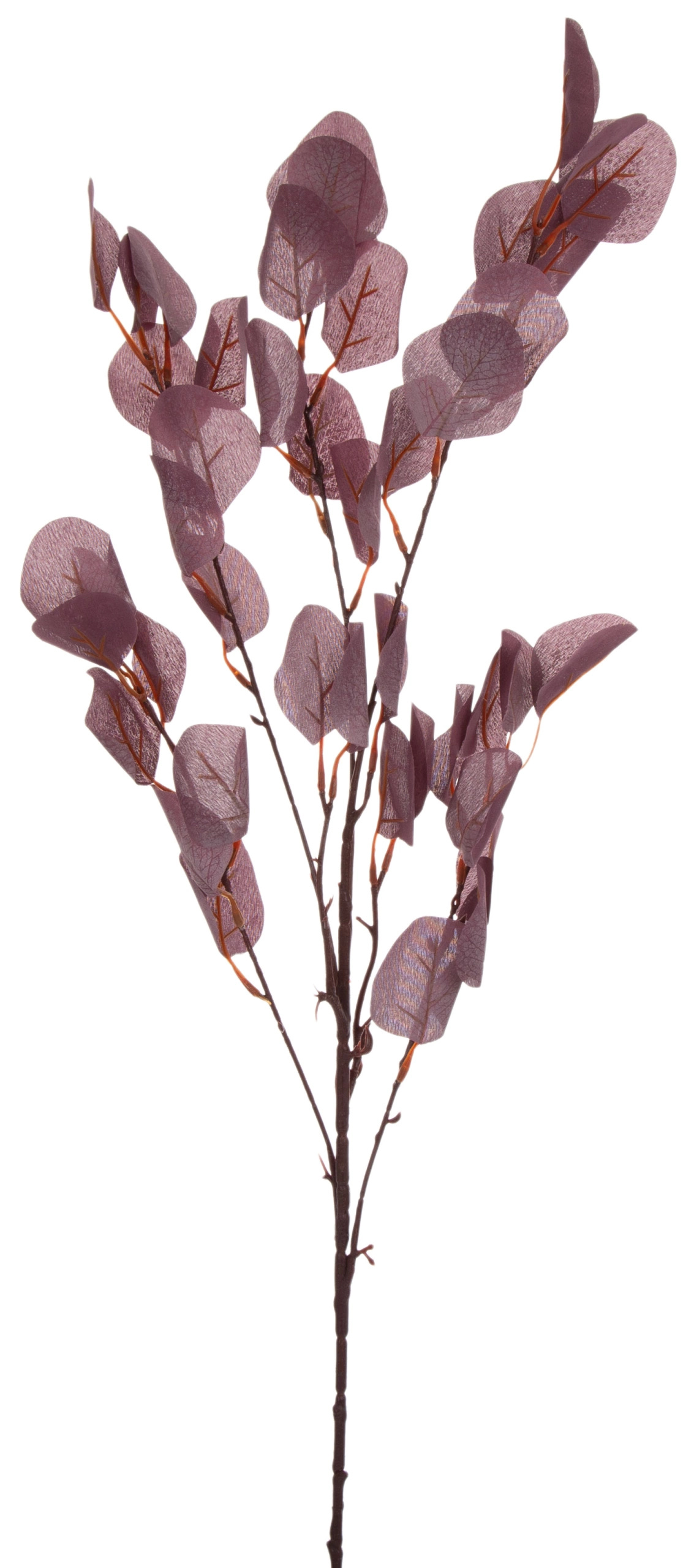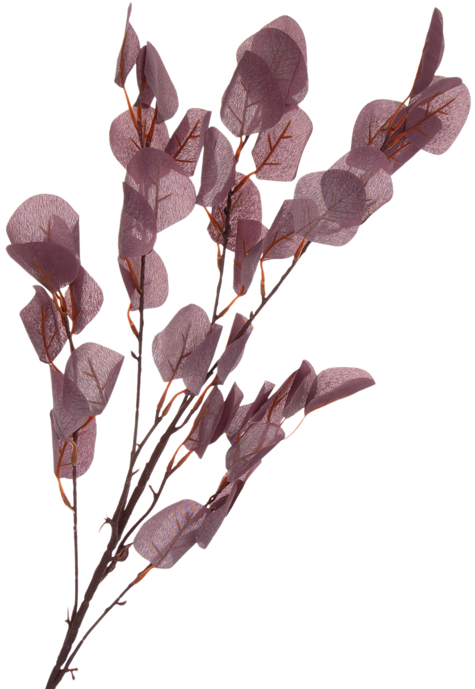 Oferta przedstawia roślinę eukaliptus. Gałązka wykonana z tworzywa sztucznego, listki z materiału w kolorze fioletowym. Roślina idealna jako dodatek kompozycji florystycznych.