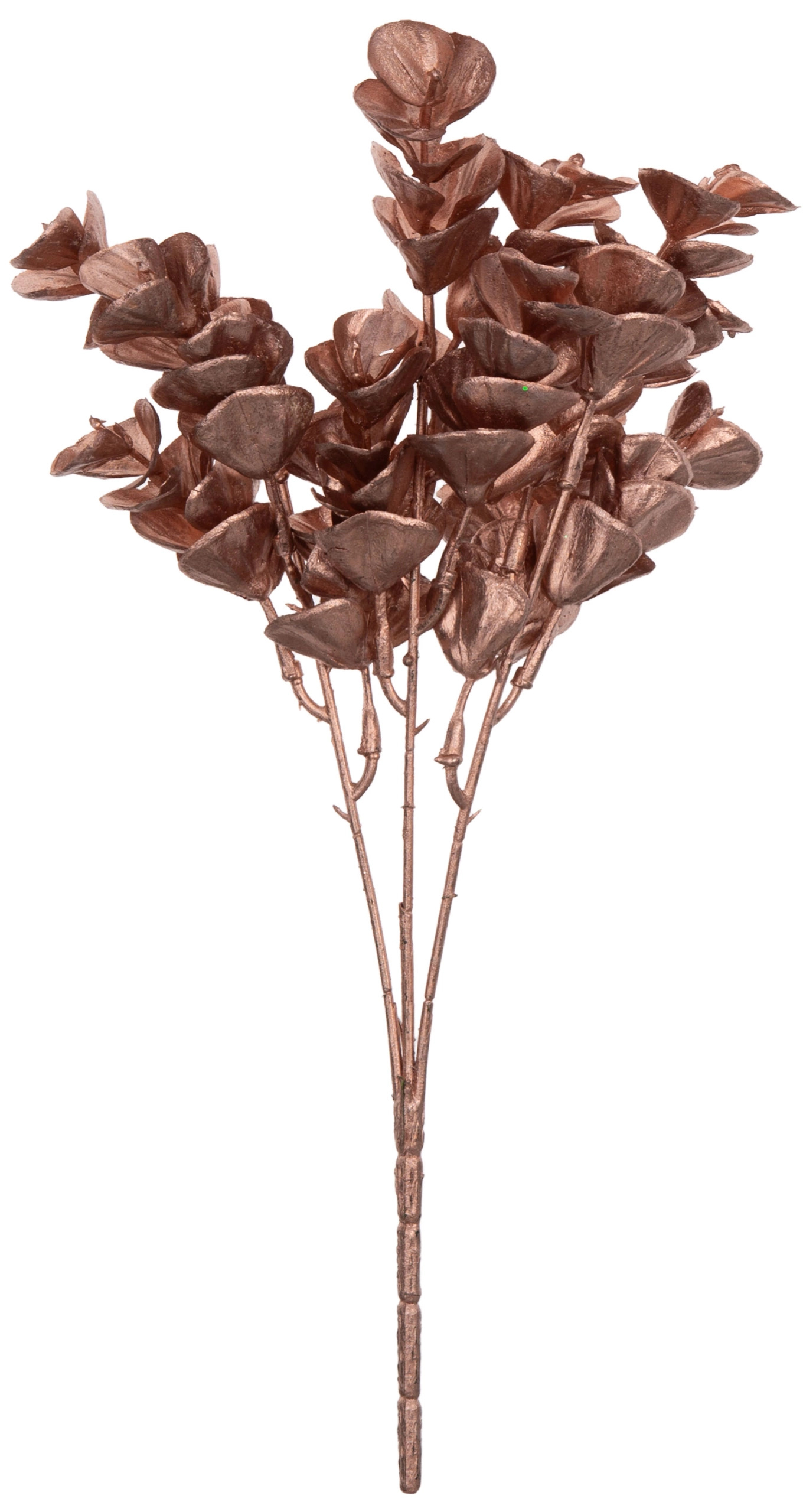 Oferta przedstawia roślinę eukaliptus, wykonaną z tworzywa sztucznego w kolorze miedzianym. Bukiet posiada trzy gałązki. Roślina idealna jako dodatek kompozycji florystycznych.