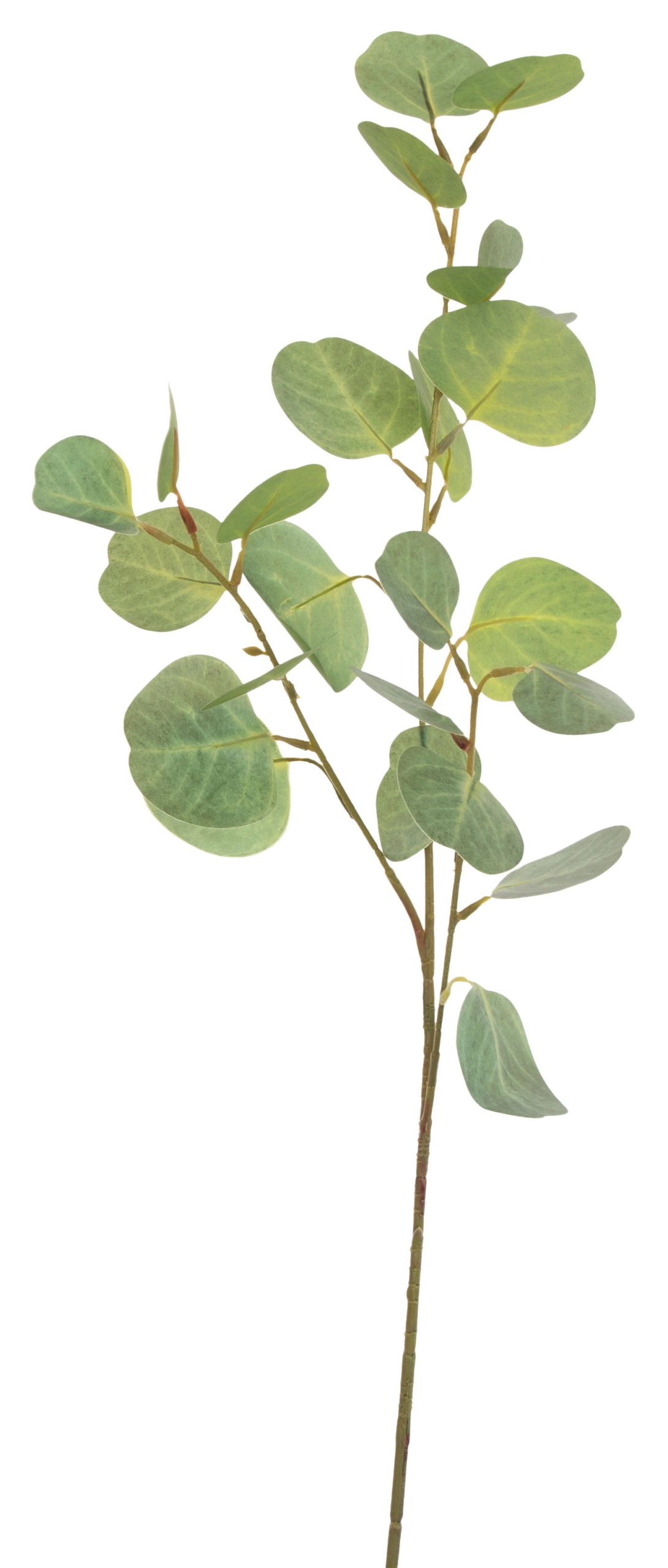 Oferta przedstawia roślinę eukaliptus. Gałązka wykonana z tworzywa sztucznego w kolorze zielonym, delikatnie bielony. Roślina idealna jako dodatek kompozycji florystycznych.