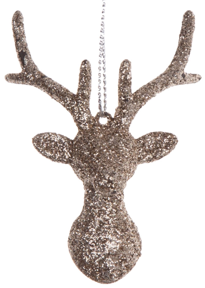 Oferta przedstawia trzy zawieszki w kształcie jelenia. Jeleń z tworzywa sztuczne w kolorze złotym z brokatem. Ozdoba idealna do dekoracji w okresie zimowo – świątecznym.