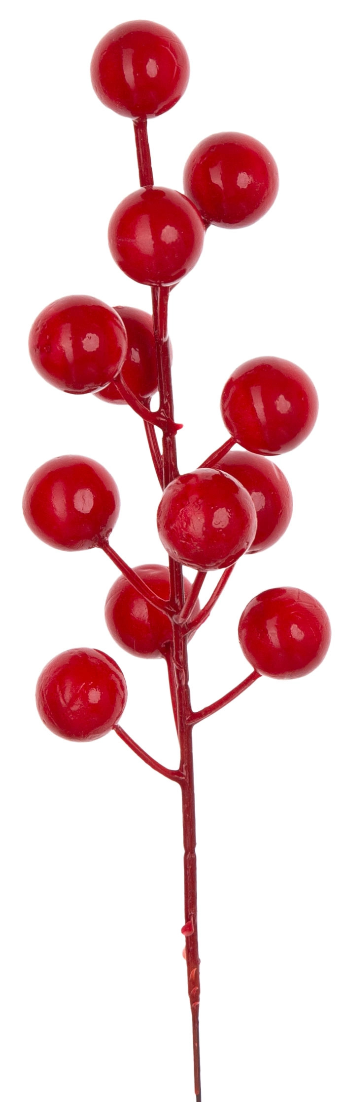 Oferta przedstawia gałązkę czerwonych kulek. Produkt został wykonany z tworzywa sztucznego. Gałązka doskonała jako dodatek do kompozycji florystycznych, wianków.