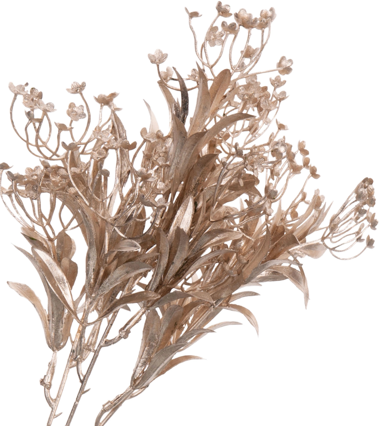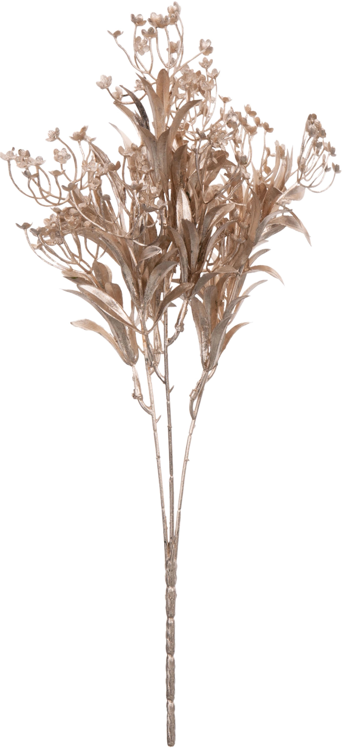 Oferta przedstawia dodatek sztuczny. Bukiet wykonany z tworzywa sztucznego w kolorze jasnego złota, posiada trzy gałązki Bukiet idealny jako dodatek do kompozycji florystycznych.