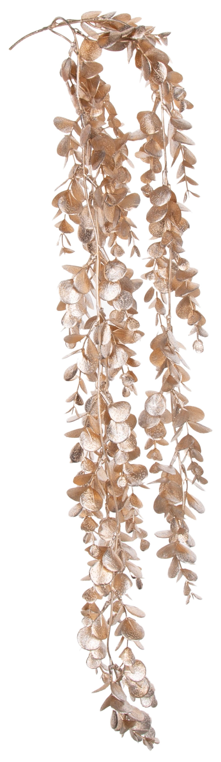 Oferta przedstawia roślinę wiszącą eukaliptus. Roślina wykonana z tworzywa sztucznego w kolorze jasnego złota. Roślina idealna jako dodatek kompozycji florystycznych.
