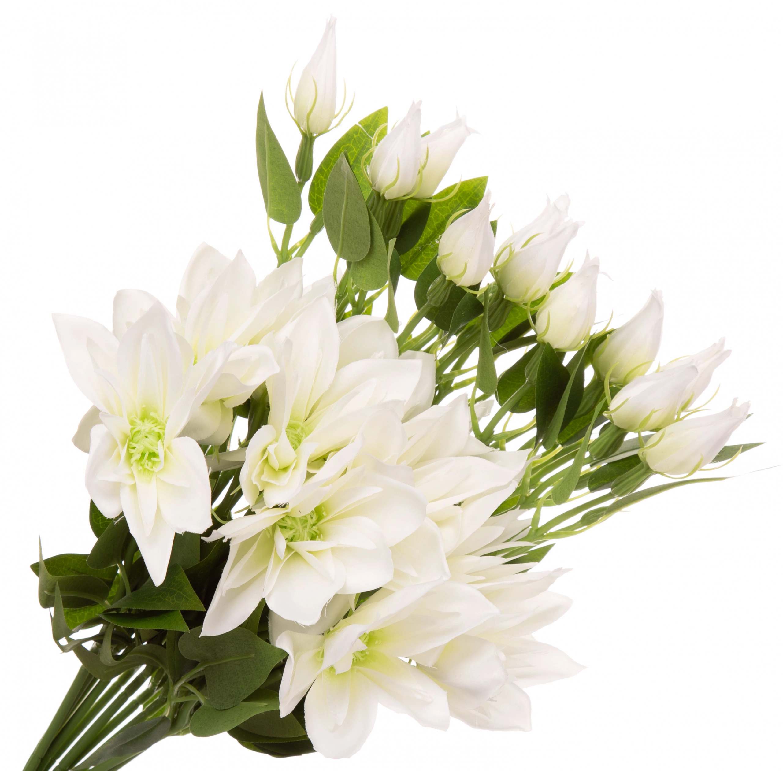 Oferta przedstawia bukiet 12 gałązek kwiatu klematis. Łodyga zielona, wykonana z tworzywa sztucznego podatna na formowanie, kwiat z materiału w kolorze jasny krem ( CREME ). Klematis pięknie prezentuje się  w wazonie., idealny do kompozycji florystycznych.
