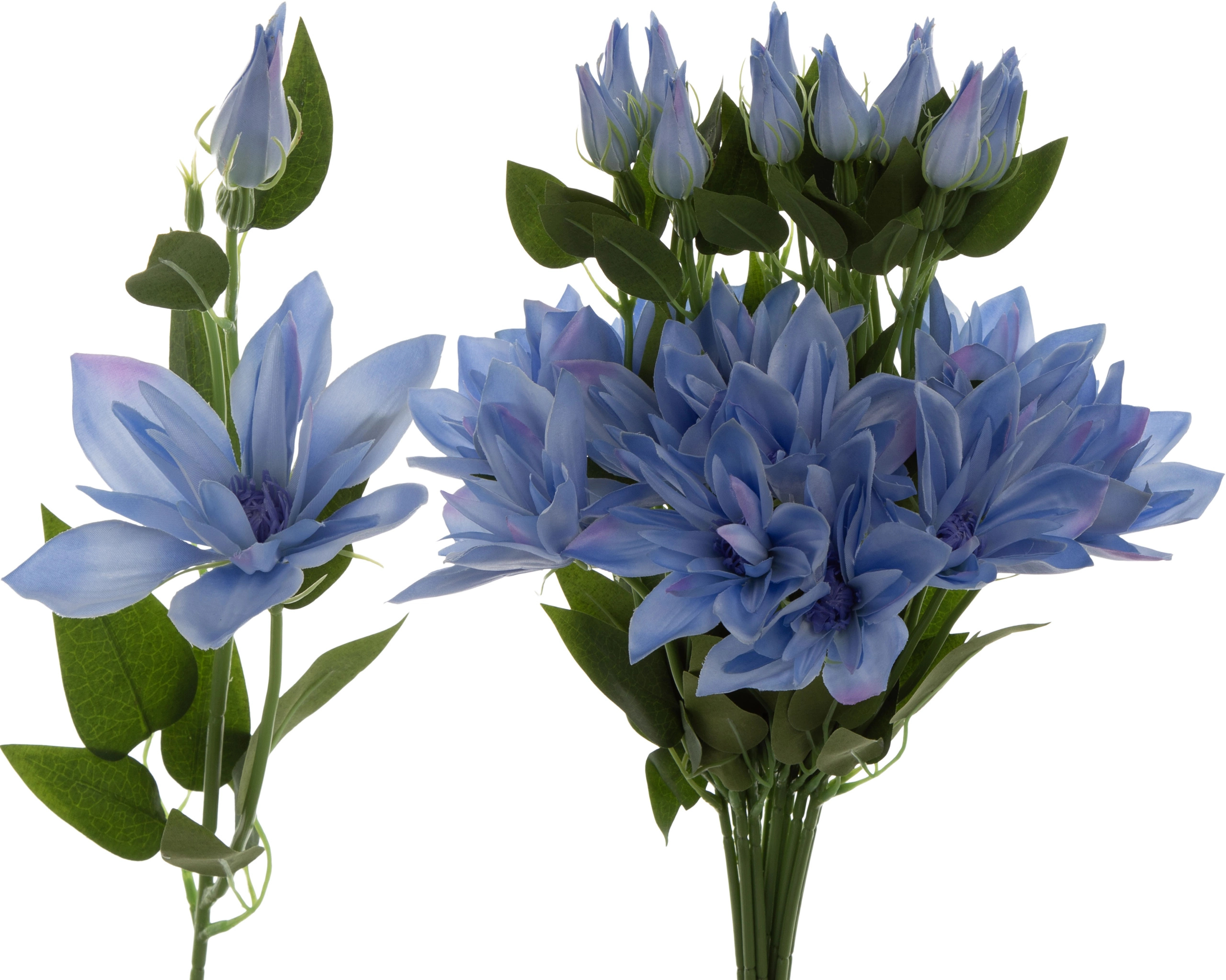 Oferta przedstawia bukiet 12 gałązek kwiatu klematis. Łodyga zielona, wykonana z tworzywa sztucznego podatna na formowanie, kwiat z materiału w kolorze niebieskim ( LT BLUE ). Klematis pięknie prezentuje się w wazonie., idealny do kompozycji florystycznych.