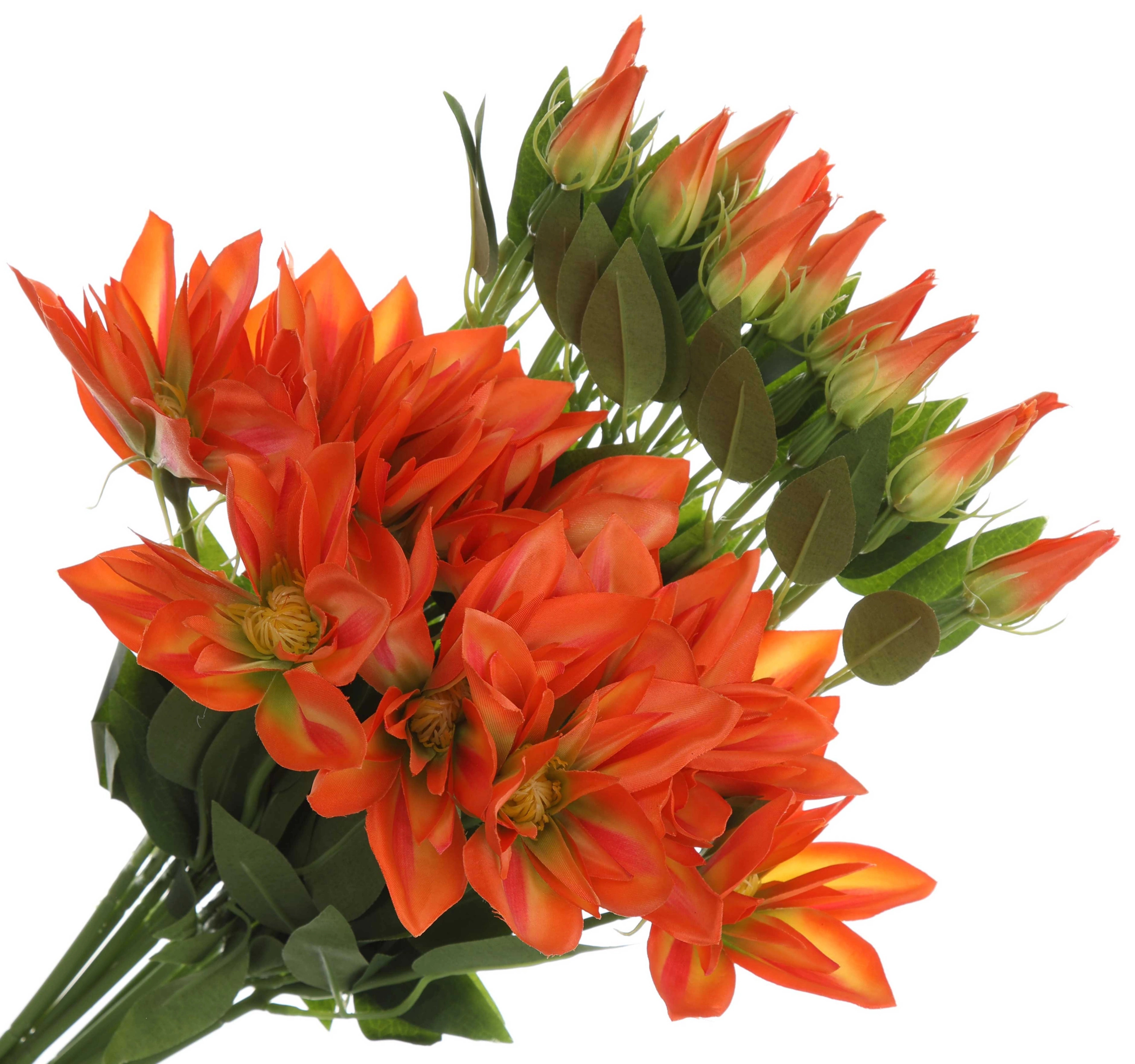 Oferta przedstawia bukiet 12 gałązek kwiatu klematis. Łodyga zielona, wykonana z tworzywa sztucznego podatna na formowanie, kwiat z materiału w kolorze pomarańczowym. Klematis pięknie prezentuje się w wazonie., idealny do kompozycji florystycznych.