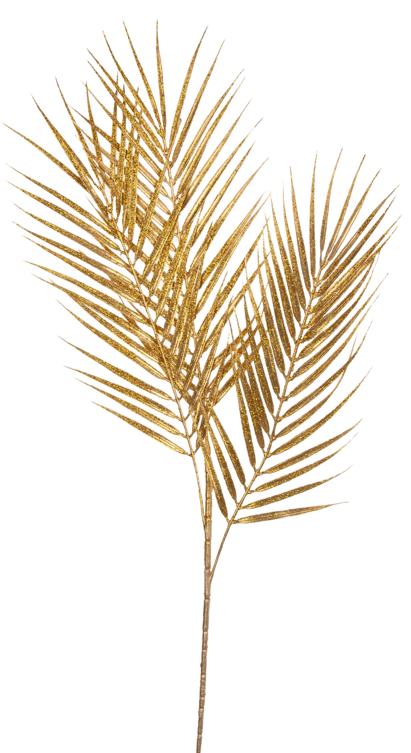Oferta przedstawia gałązkę z trzema liśćmi palmy. Produkt został wykonany z tworzywa sztucznego w kolorze złotym, brokat. Liść doskonały jako wypełniacz do wyrobów florystycznych, oraz kompozycji kwiatowych.