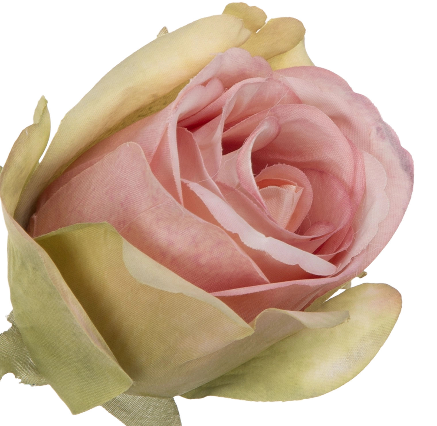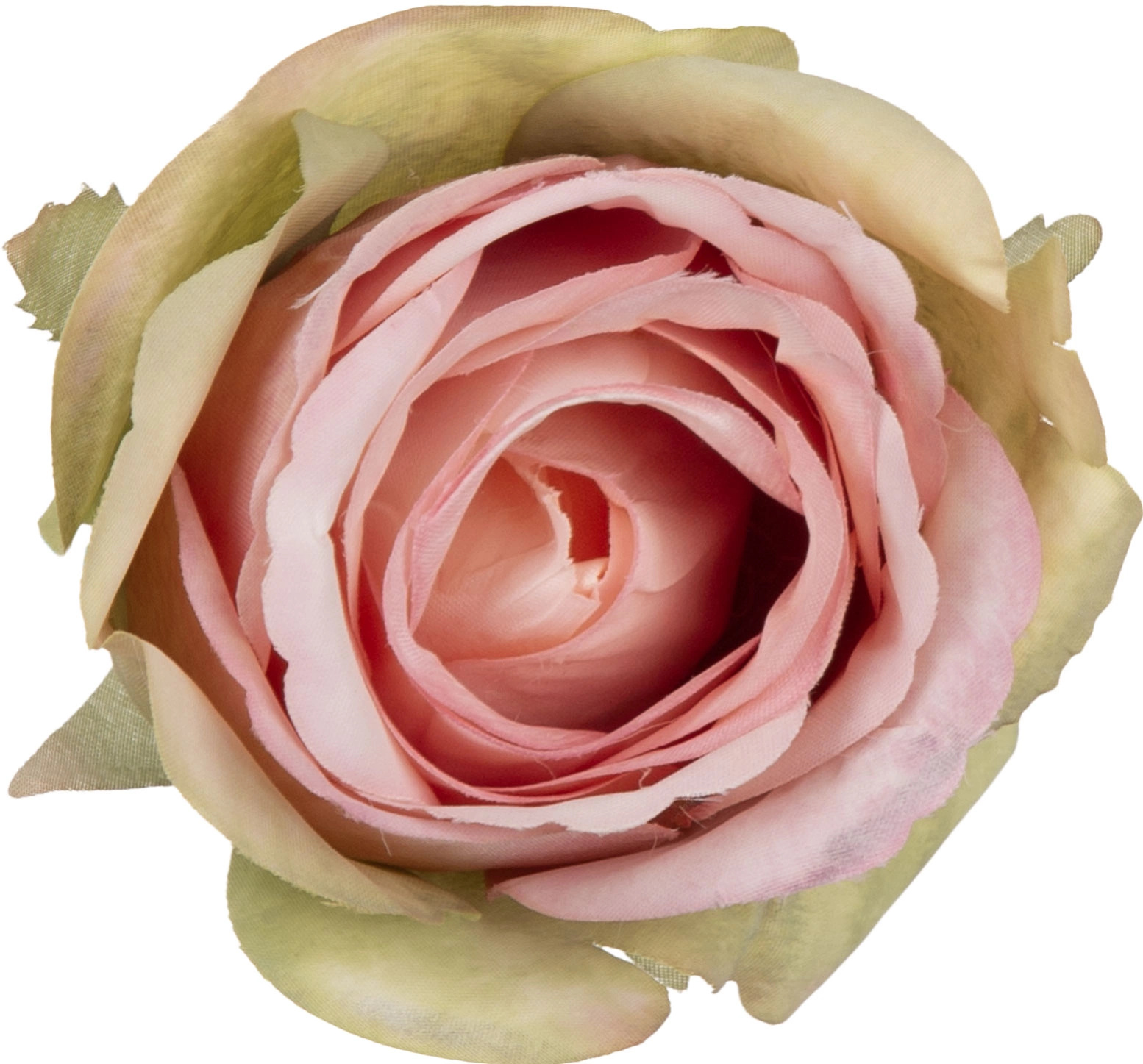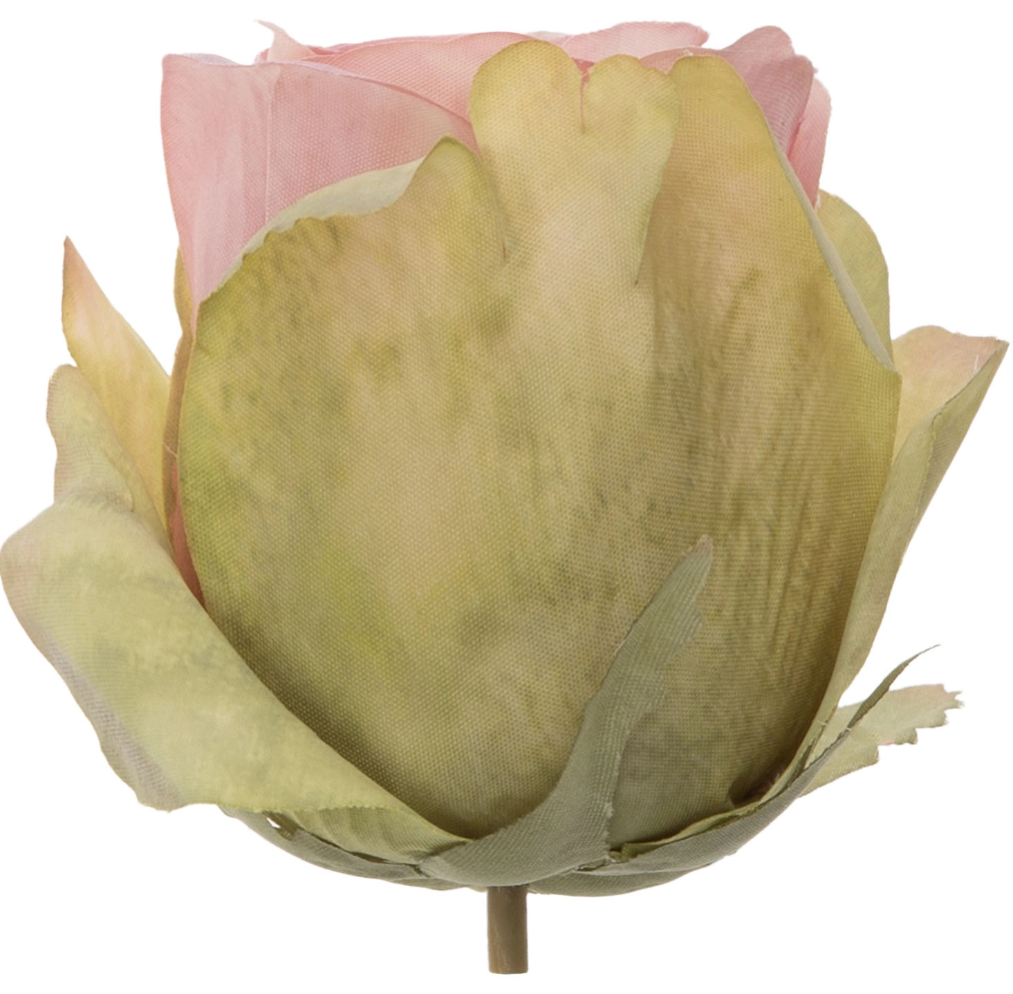 Oferta przedstawia dużą główkę róży wyrobowej. Produkt został wykonany z wysokiej jakości materiału. Główka róży jest w kolorze jasny róż. Na odwrocie znajdują się zielone listki o nierównym kształcie i rozmiarze. Róża posiada gęsto osadzone płatki w różnych rozmiarach, co nadaje jej objętości. Dodatkowo róża posiada miejsce na drut wyrobowy lub łodygę. Kwiat idealny do dekoracji, lub kompozycji florystycznych. Opakowanie zawiera 12 sztuk. Na innej naszej aukcji duży wybór łodyg i liści róży.