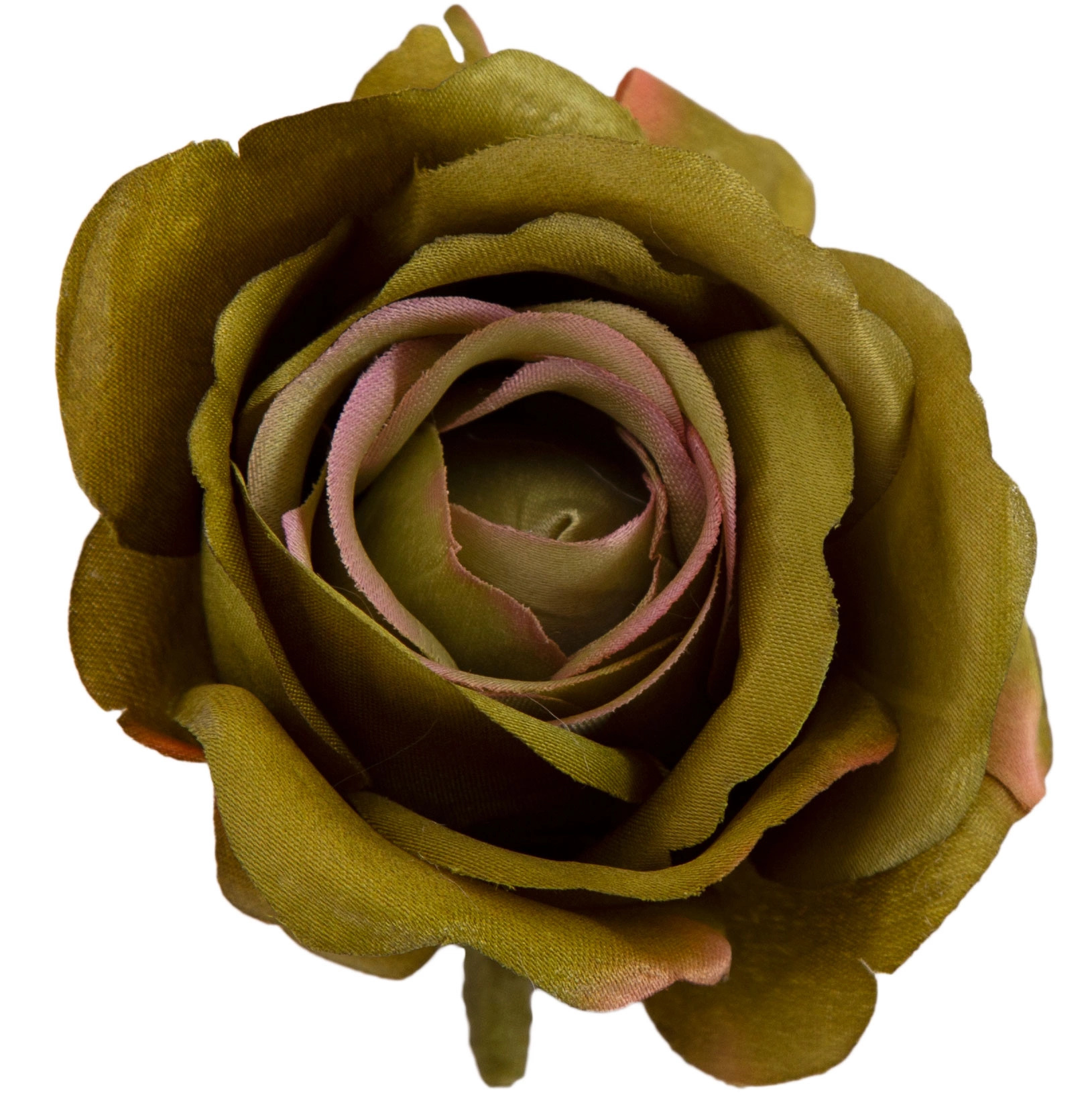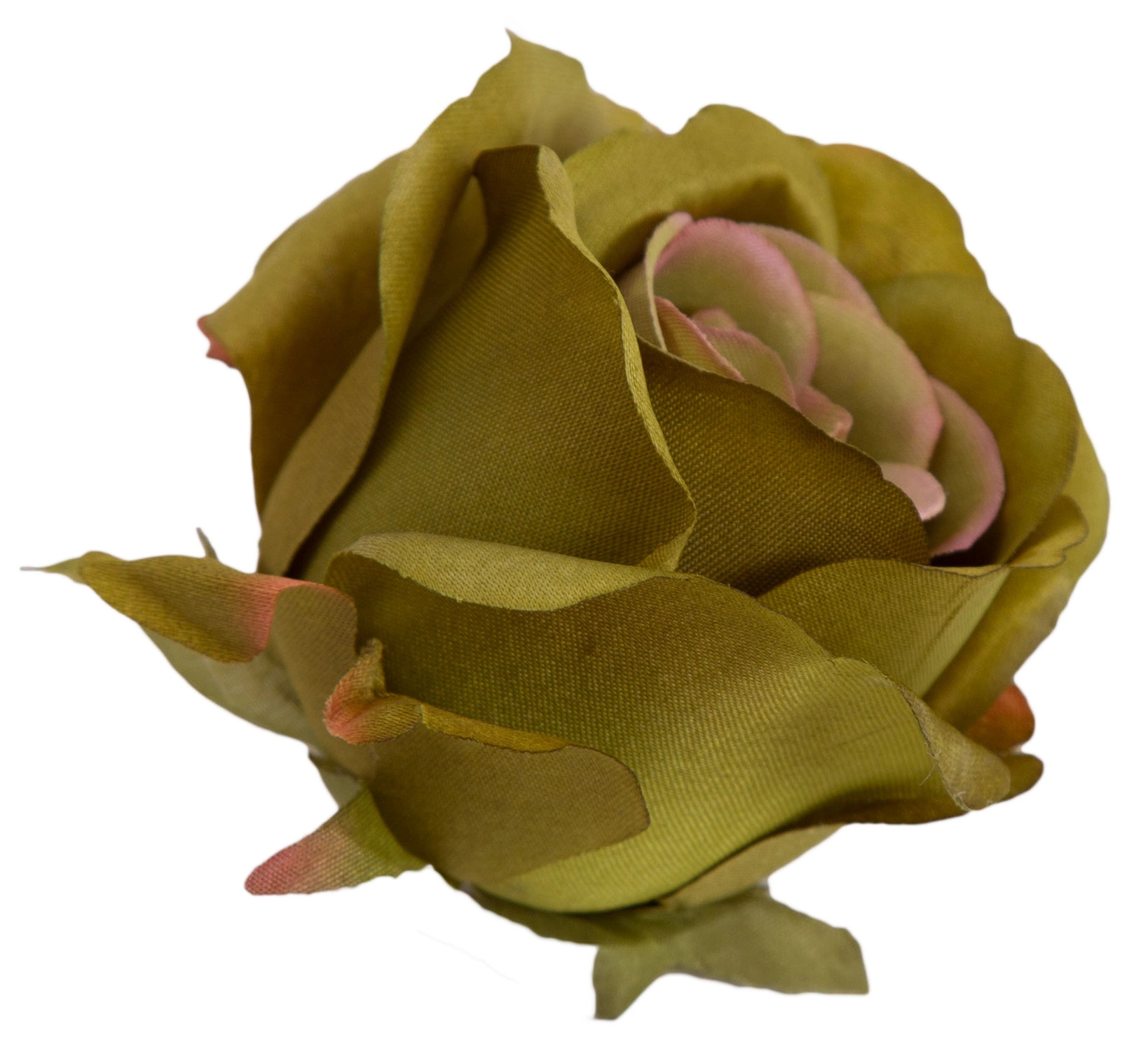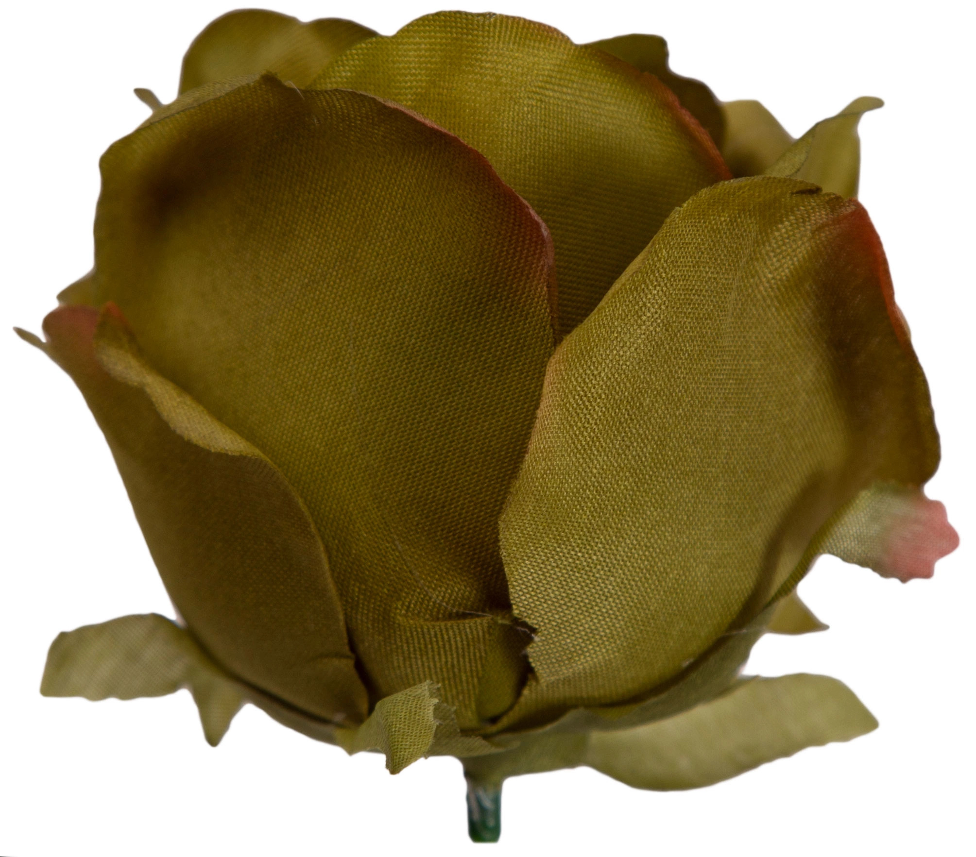 Oferta przedstawia dużą główkę róży wyrobowej. Produkt został wykonany z wysokiej jakości materiału. Główka róży jest w kolorze oliwki z delikatnymi przebarwieniami różu ( opis z metki olive / pink ). Na odwrocie znajdują się zielone listki o nierównym kształcie i rozmiarze, delikatnie podbarwione kolorem bordowym. Róża posiada gęsto osadzone płatki w różnych rozmiarach, co nadaje jej objętości. Dodatkowo róża posiada miejsce na drut wyrobowy lub łodygę. Kwiat idealny do dekoracji, lub kompozycji florystycznych. Opakowanie zawiera 12 sztuk. Na innej naszej aukcji duży wybór łodyg i liści róży.