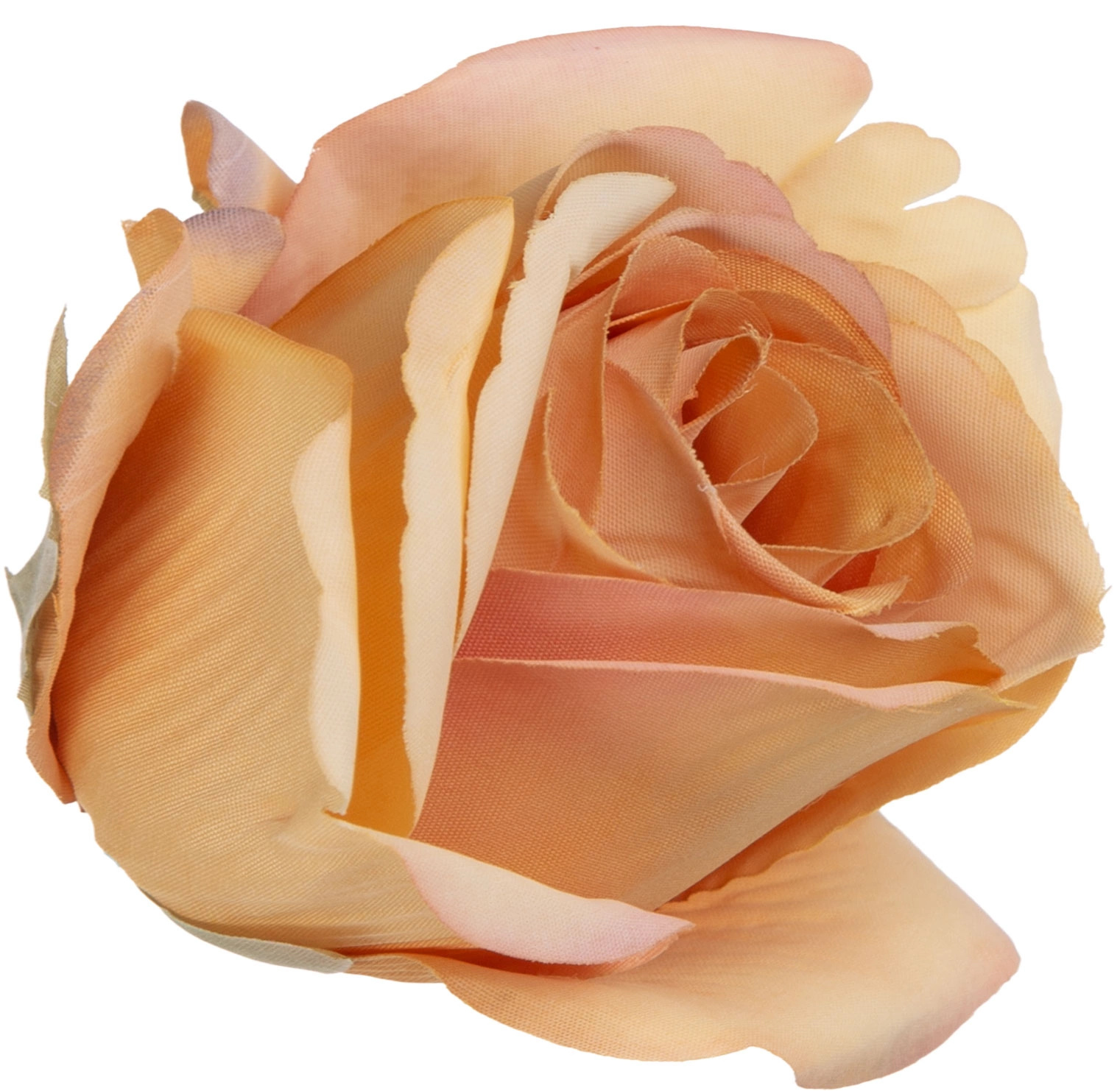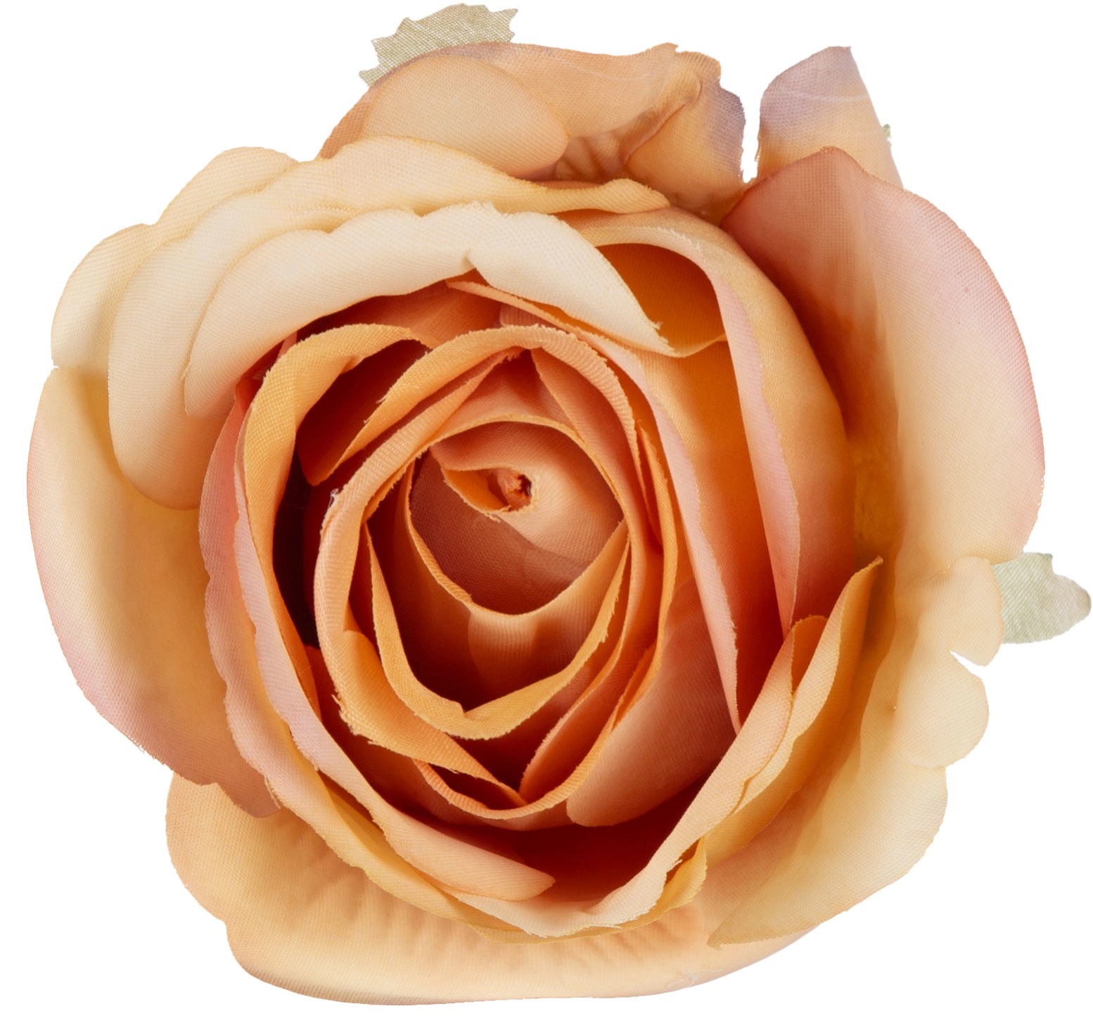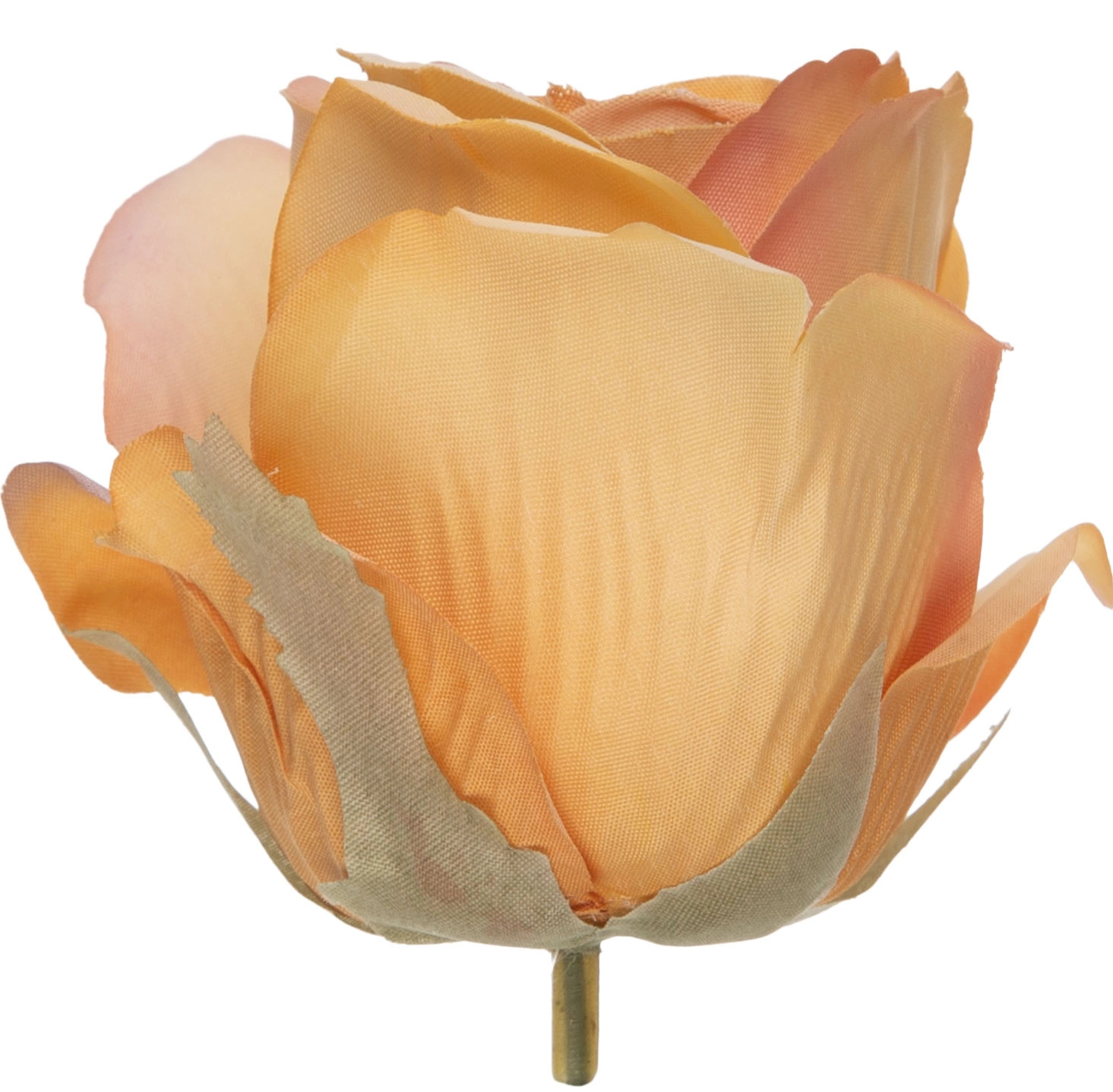 Oferta przedstawia dużą główkę róży wyrobowej. Produkt został wykonany z wysokiej jakości materiału. Główka róży jest w kolorze pomarańczowym. Na odwrocie znajdują się zielone listki o nierównym kształcie i rozmiarze. Róża posiada gęsto osadzone płatki w różnych rozmiarach, co nadaje jej objętości. Dodatkowo róża posiada miejsce na drut wyrobowy lub łodygę. Kwiat idealny do dekoracji, lub kompozycji florystycznych. Opakowanie zawiera 12 sztuk. Na innej naszej aukcji duży wybór łodyg i liści róży.
