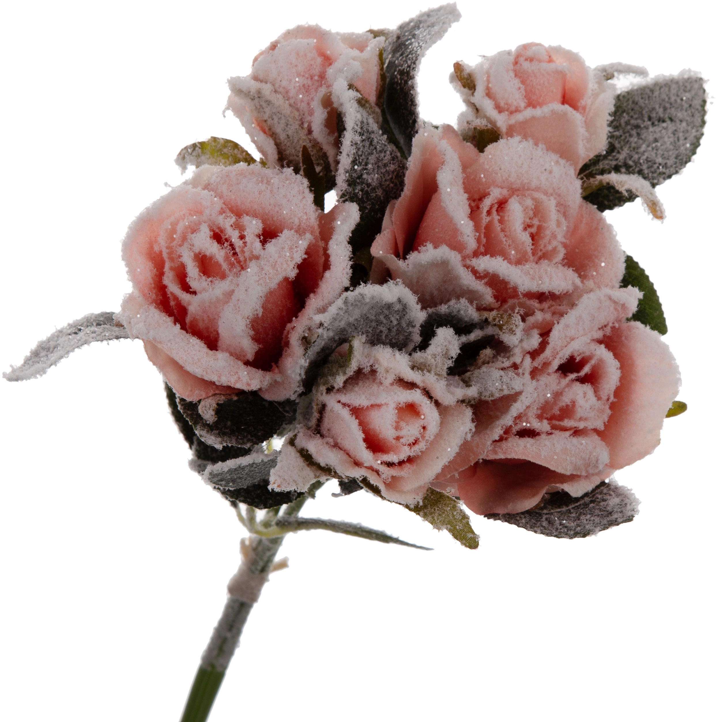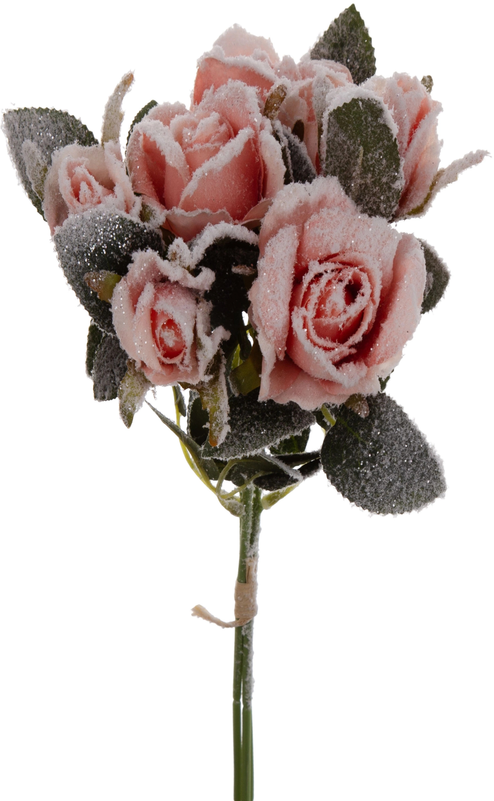 Oferta przedstawia bukiet róż. Bukiecik  z trzech gałązek róż, na każdej gałązce dwa kwiaty. Róże w kolorze różowym, ośnieżone.