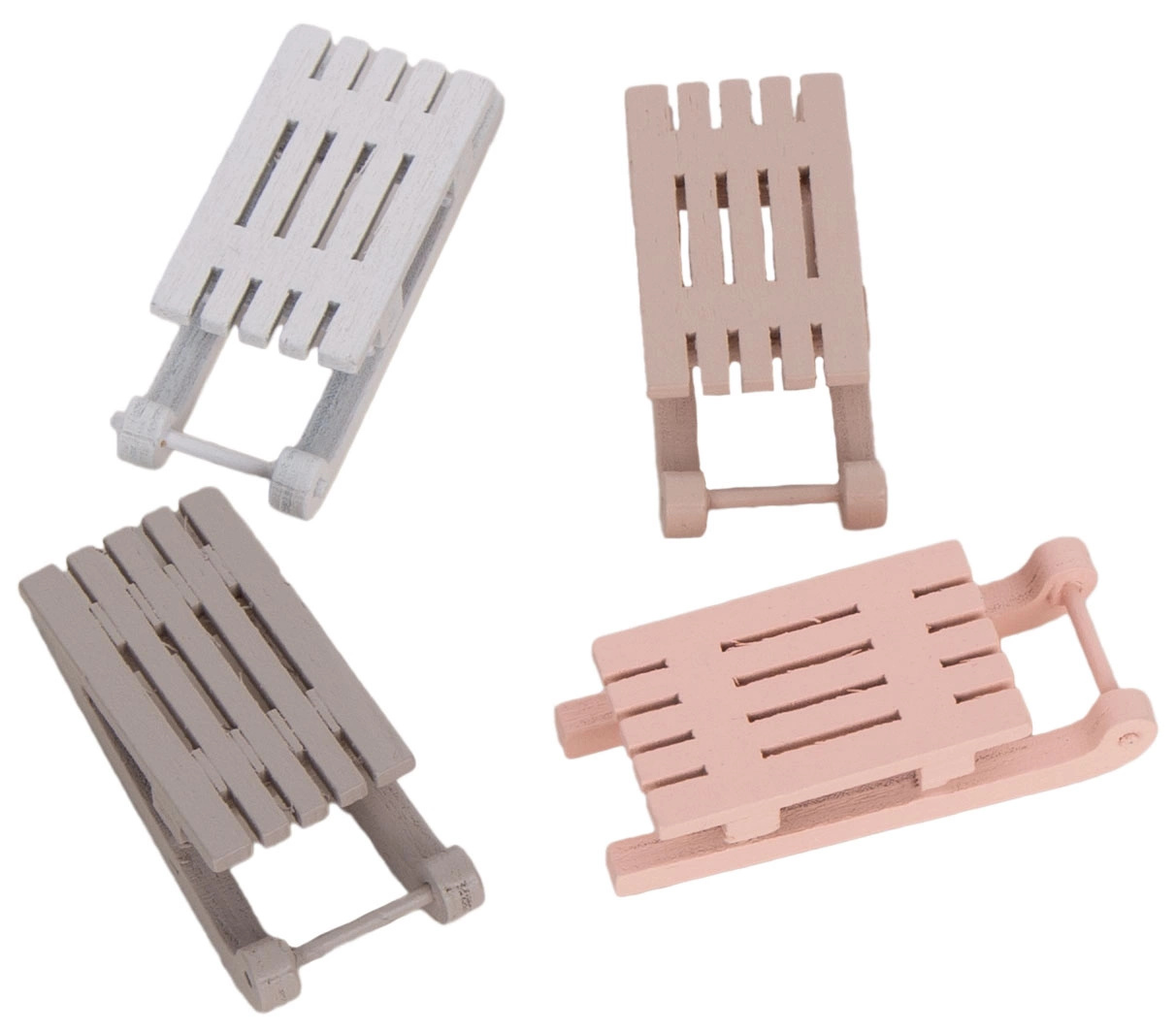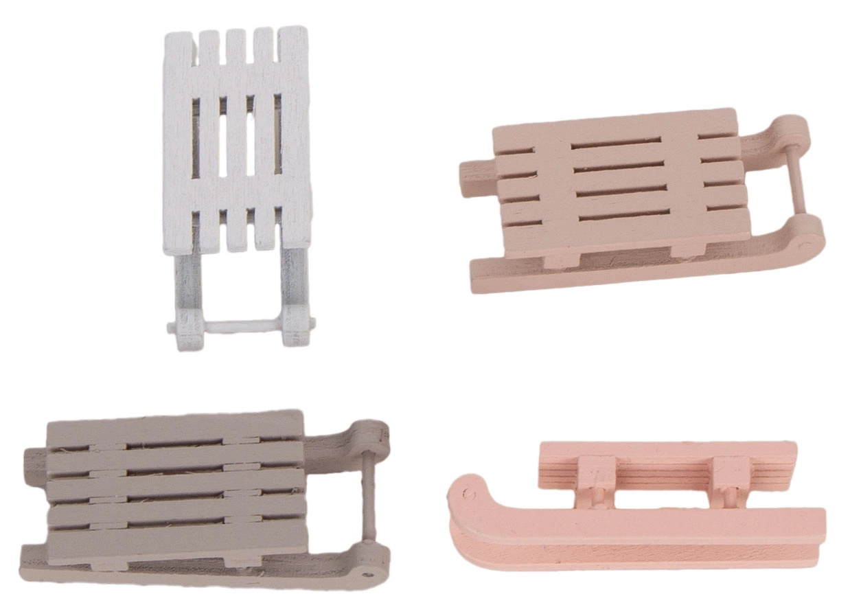 Oferta przedstawia drewniane saneczki. Ozdoba idealna do dekoracji w okresie zimowo – świątecznym. Opakowanie 4 sztuk.