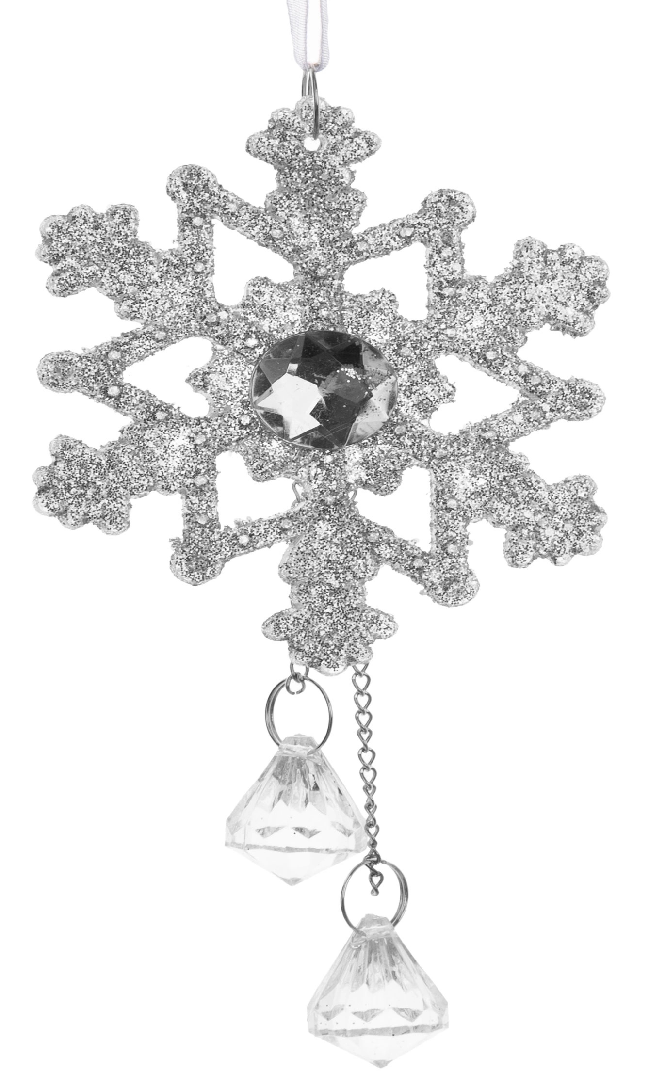 Oferta przedstawia dwie zawieszki w kształcie śnieżynki. Śnieżynka z tworzywa sztuczne w kolorze srebrnym z wiszącym kryształkiem. Ozdoba idealna do dekoracji w okresie zimowo – świątecznym.