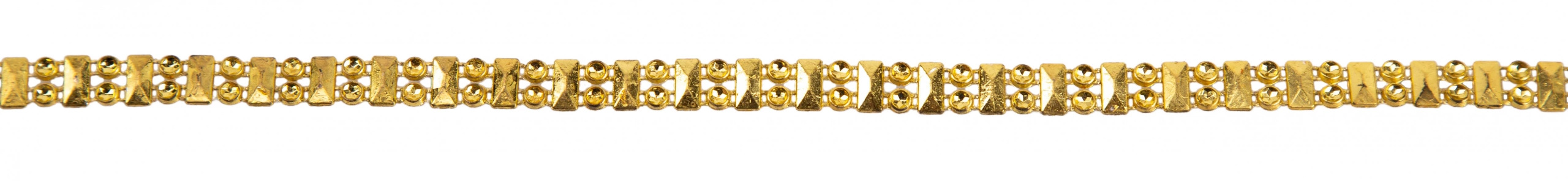 Oferta przedstawią taśmę ozdobną w kolorze złotym, wzór prostokąty z imitacją cyrkonii. Taśmę można wykorzystać na wiele sposobów na przykład do zdobienia firan, zasłon, ceramiki, zniczy, kart okolicznościowych, wnętrz w stylu glamour.