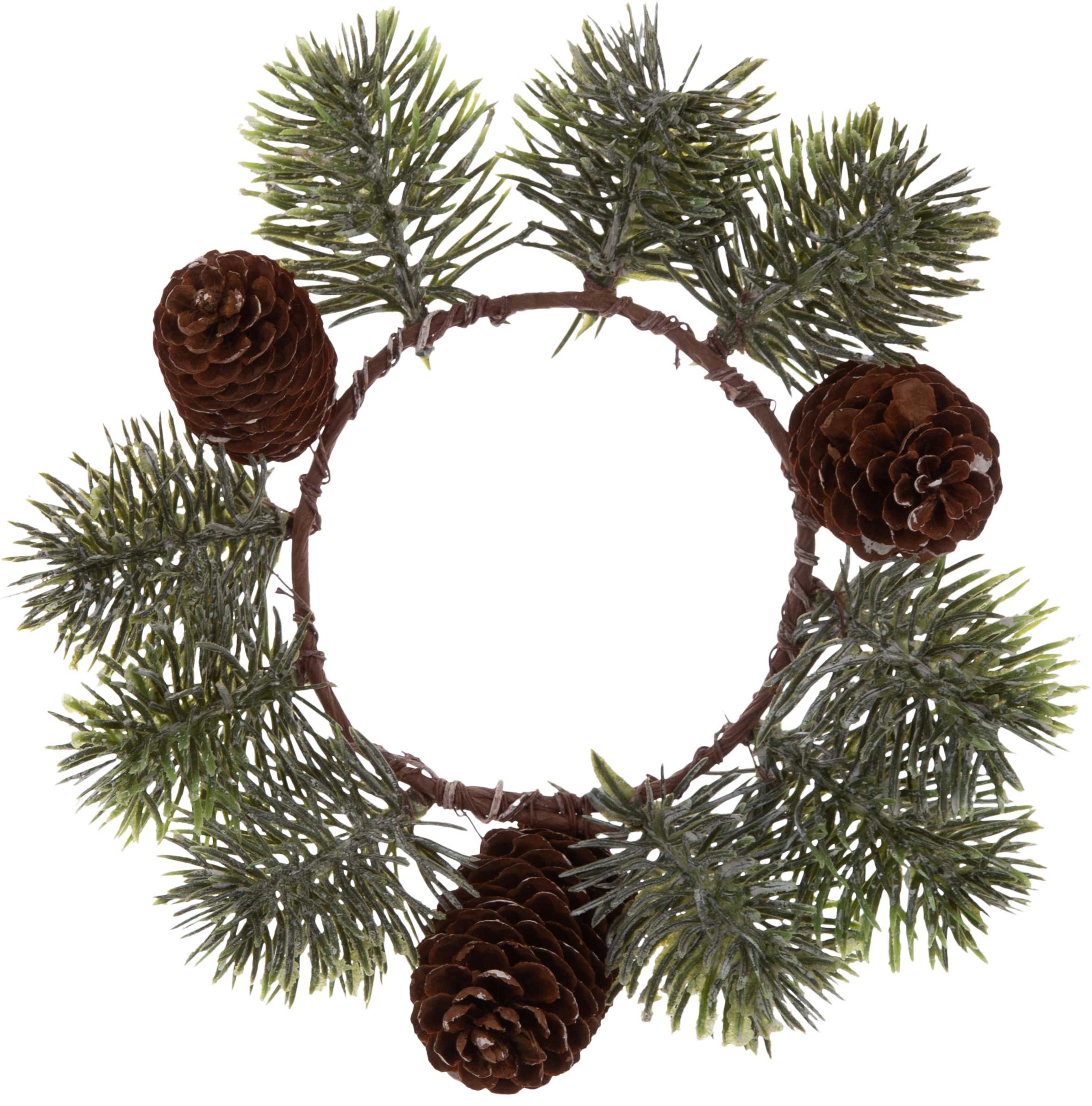 Wianek iglasty z szyszkami wykonany z tworzywa sztucznego. Wianek idealny jako stroik na świecę.