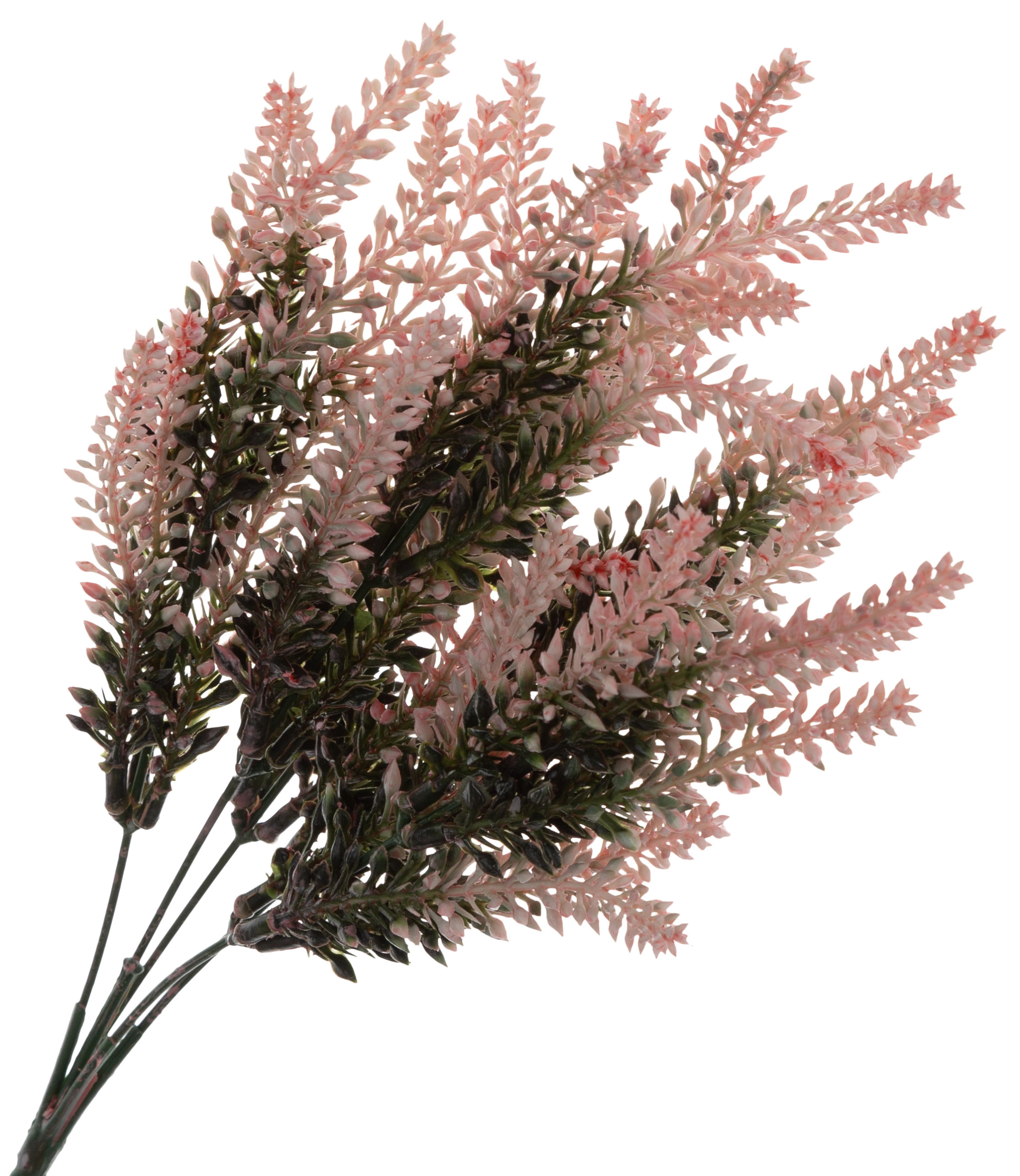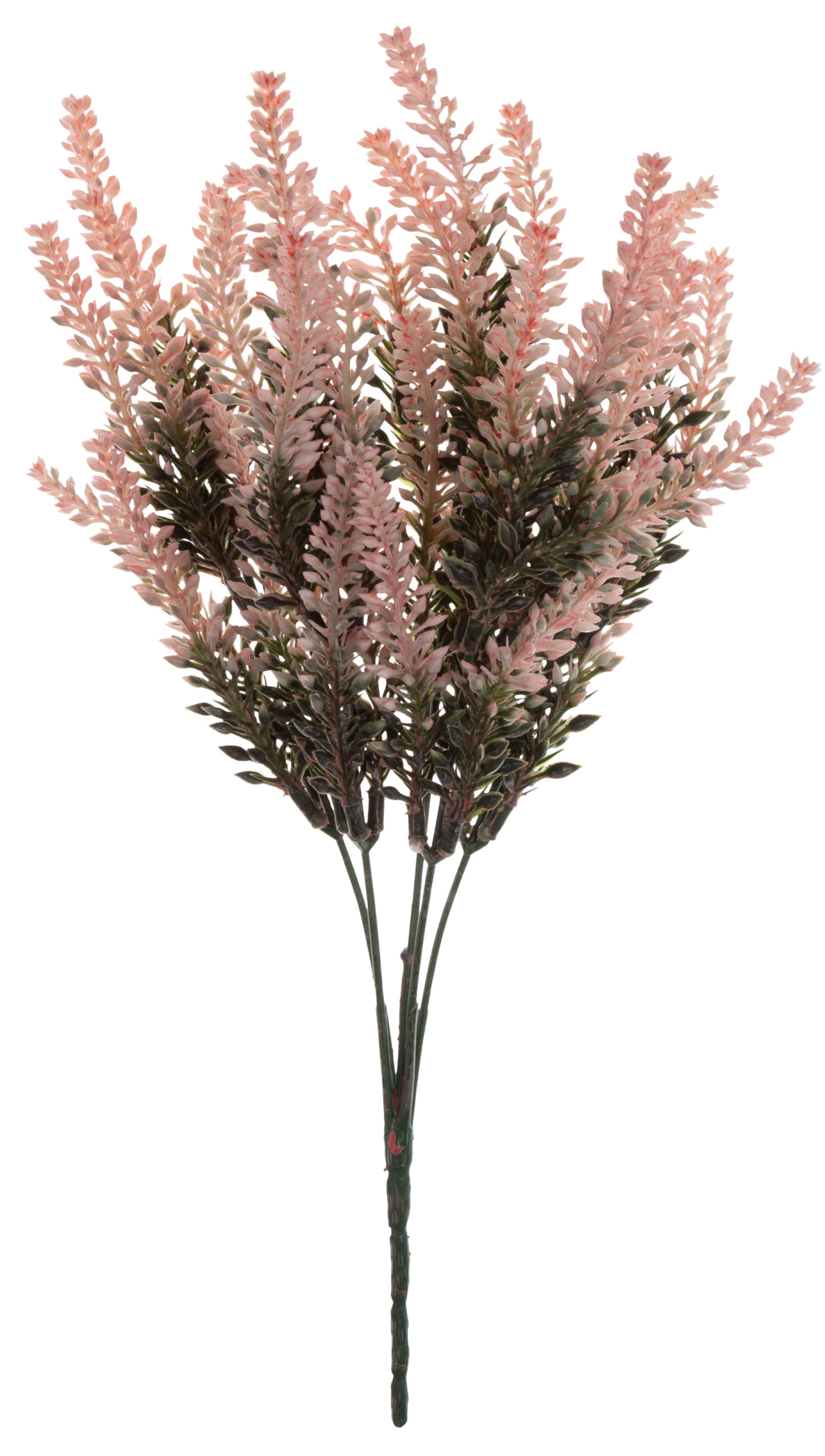 Oferta przedstawia bukiet wrzosiec na piku. Produkt został wykonany z wysokiej jakości tworzywa. Łodyga posiada pięć gałązek, a każda z nich zakończona jest kwiatostanem w kolorze jasnego różu. Roślina idealna do kompozycji florystycznych lub jako samodzielna ozdoba.