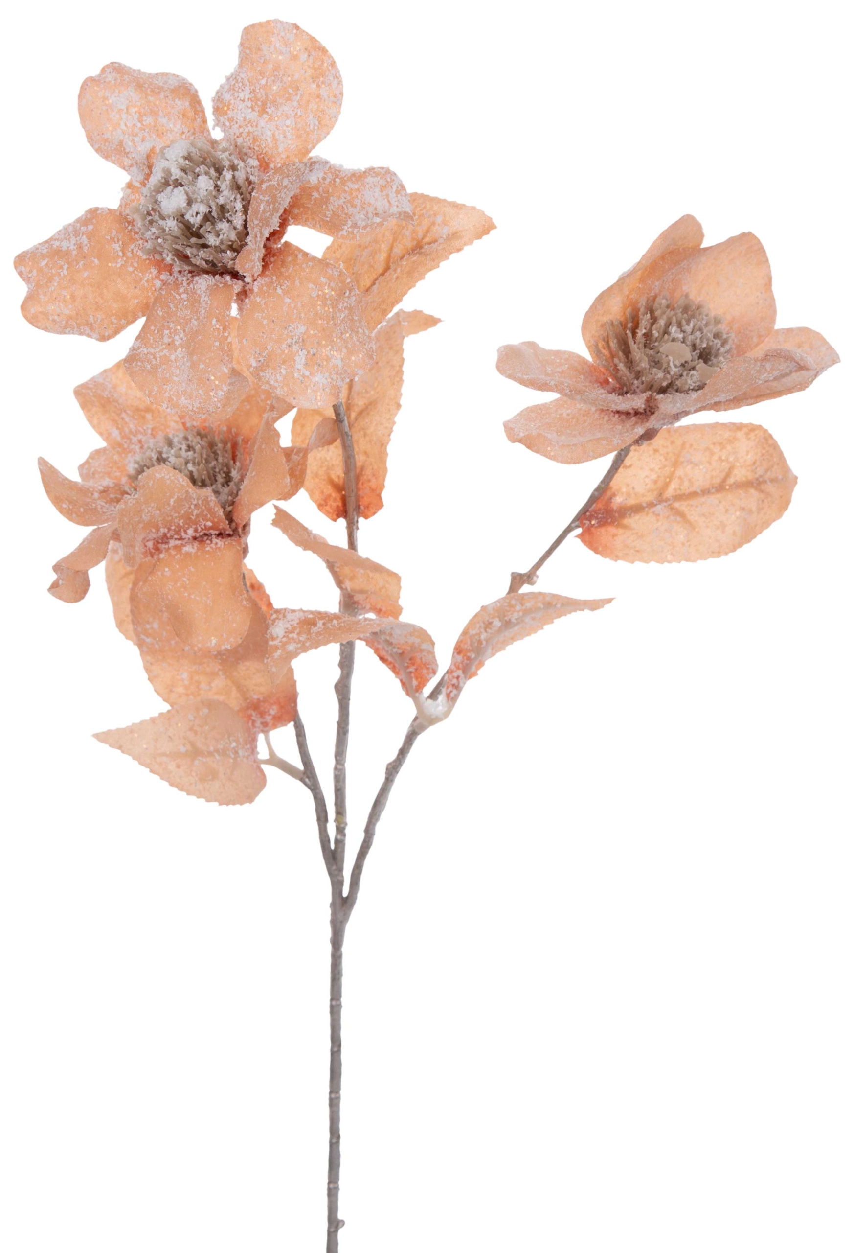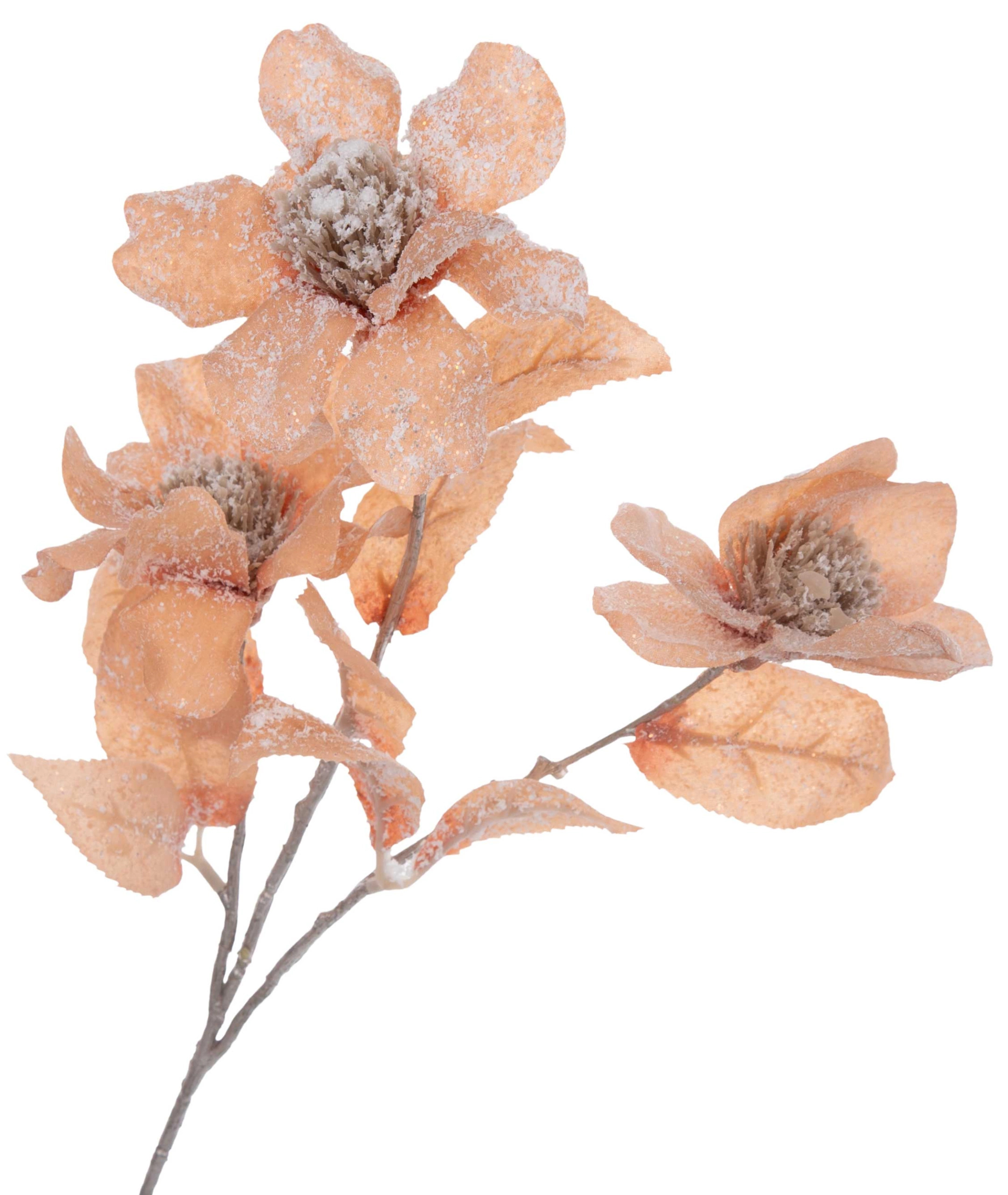 Oferta przedstawia kwiat sztuczny łodygowy – zawilec. Produkt został wykonany z materiału. Kwiaty w kolorze brzoskwiniowym, ośnieżone. Kwiat doskonały do dekoracji wnętrz, lub jako ozdoba w wazonie.